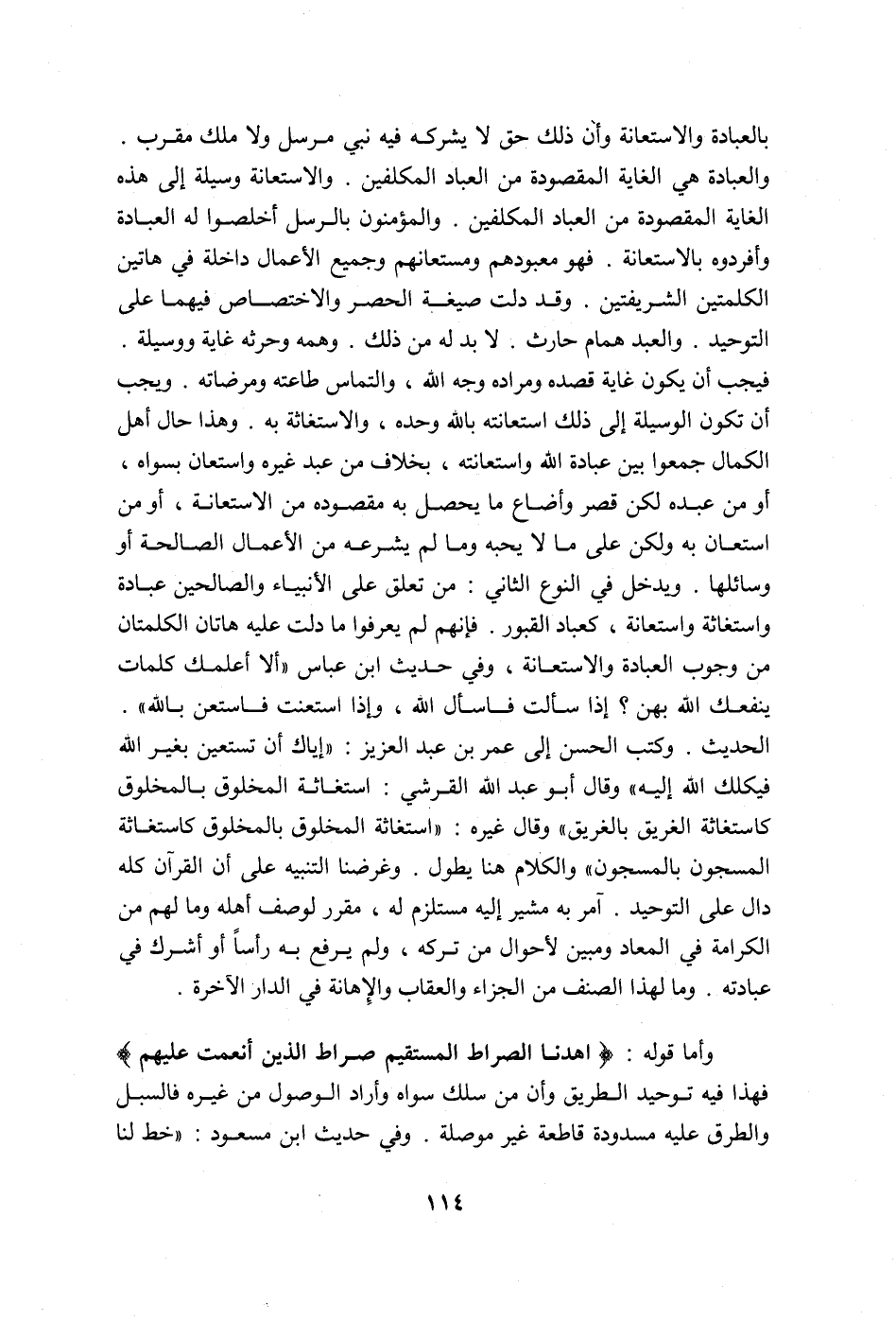 بالعبادة والاستعانة وأن ذلك حق لا يشركه فيه نبي مرسل، ولا ملك مقرب. والعبادة هي الغاية المقصودة من العباد المكلفين, والاستعانة وسيلة إلى هذه الغاية المقصودة من العباد المكلفين. والمؤمنون بالرسل أخلصوا له العبادة وأفردوه بالاستعانة. فهو معبودهم ومستعانهم وجميع الأعمال داخلة في هاتين الكلمتين الشريفتين، وقد دلت صيغة الحصر والاختصاص فيهما على التوحيد. والعبد همام وحارث، لا بد له من ذلك، وهمه وحرثه غاية ووسيلة فيجب أن يكون غاية قصده ومراده وجه الله، والتماس طاعته ومرضاته، ويجب أن تكون الوسيلة إلى ذلك استعانته بخلاف من عبد غيره واستعان بسواه، أو من عبده لكن قصر وأضاع ما يحصل به مقصوده من الاستعانة، أو من استعان به ولكن على ما لا يحبه وما لم يشرعه من الأعمال الصالحة أو وسائلها. ويدخل في النوع الثاني: من تعلق على الأنبياء والصالحين عبادة واستغاثة واستعانة، كعبّاد القبور، وفي حديث ابن عباس: "ألا أعلمك كلمات ينفعك الله بهن؟ إذا سألت فاسأل الله، وإذا استعنت فاستعن بالله" الحديث.