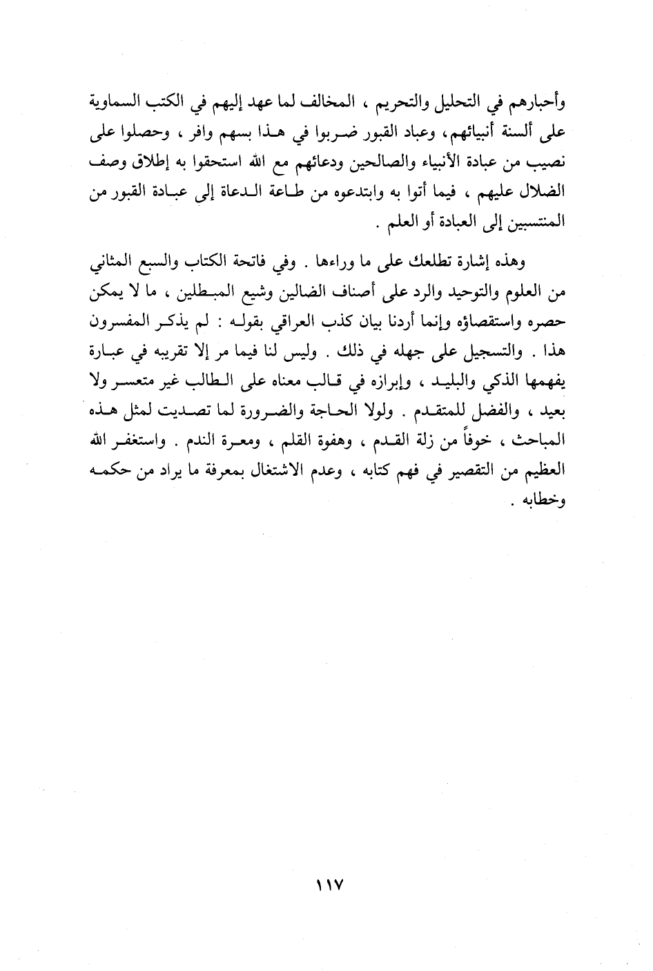 وهذه إشارة تطلعك على ما وراءها. وفي فاتحة الكتاب والسبع والمثاني من العلوم والتوحيد والرّد على أصناف الضالين وشيع المبطلين، ما لا يمكن حصره واستقصاؤه وإنما أردنا بيان كذب العراقي بقوله: لم يذكر المفسرون هذا. والتسجيل على جهله في ذلك، وليس لنا فيما مر إلا تقريبه في عبارة يفهمها الذكي والبليد، وإبرازه في قالب معناه على الطالب غير متعسر ولا بعيد، والفضل للمتقدم. ولولا الحاجة والضرورة لما تصديت لمثل هذه المباحث، خوفاً من زلة القدم، وهفوة القلم، ومعرّة النّدم، وأستغفر الله العظيم من التقصير في فهم كتابه، وعدم الاشتغال بمعرفة ما يراد من حكمه وخطابه.
