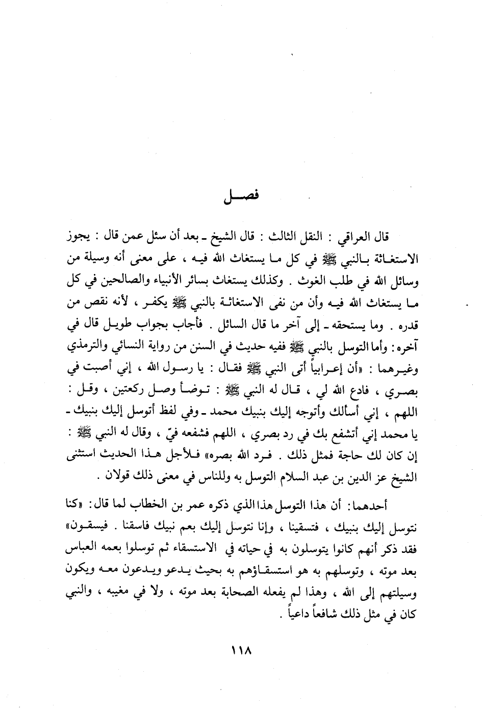قال العراقي: النقل الثالث: قال الشيخ ـ بعد أن سئل عمن قال: يجوز الاستغاثة بالنبي صلى الله عليه وسلّم في كلّ ما يستغاث الله فيه على معنى أنه وسيلة من وسائل الله في طلب الغوث، وكذلك يستغاث بسائر الأنبياء والصالحين في كل ما يستغاث الله فيه، وأن من نفى الاستغاثة بالنبي يكفر؛ لأنه نقص من قدر وما يستحقه ـ إلى آخر ما قال السائل، فأجاء بجواب طويل قال في آخره: "وأمّا التوسل بالنبي صلى الله عليه وسلّم ففيه حديث في السنن من رواية النسائي والترمذي وغيرهما: "أن أعرابيّاً أتى النّبي صلى الله عليه وسلّم فقال: يا رسول الله، إنّي أُصبت في بصري، فادع الله لي، قال له النّبي صلى الله عليه وسلّم: توضأ وصل ركعتين وقل: اللهم، إني أسألك وأتوجه إليك بنبيك محمد ـ وفي لفظ: أتوسل إليك بنبيك ـ يا محمد إني أتشفع بك في ردّ بصري، اللهم فشفعه فيّ، وقال له النّبي صلى الله عليه وسلّم: إن كان لك حاجة فمثل ذلك، فرد الله بصره" فلأجل هذا الحديث استثنى الشيخ عز الدين بن عبد السلام التوسّل به وللناس في معنى ذلك قولان: