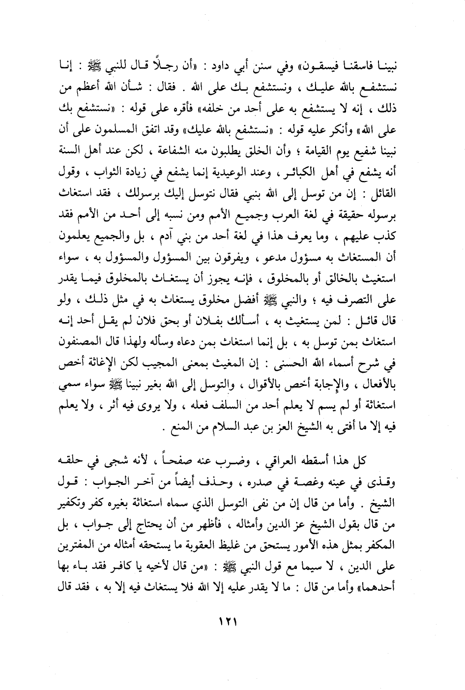 كلّ هذا أسقطه العراقي، وضرب عنه صفحاً، لأنه شجى في حلقه وقذى في عينه وغصّة في صدره، وحذف أيضاً من آخر الجواب: قول الشيخ: " وأما من قال: إن من نفي التوسل الذي سماه استغاثة بغيره كفر، وتكفير من قال بقول الشيخ عز الدين وأمثاله، فأظهر من أن يحتاج إلى جواب، بل المُكَفِّر بمثل هذه الأمور، يستحق من غليظ العقوبة والتعزير ما يستحقه أمثاله، من المفترين على الدين، لا سيما مع قول النبي صلى الله عليه وسلم: " من قال لأخيه: كافر فقد باء بها أحدهما ".
