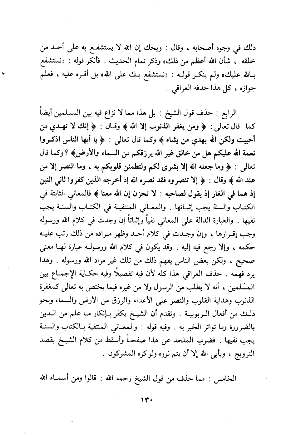 حذف العراقي هذا كله لأن فيه تفصيلاً وفيه حكاية الإجماع بين المسلمين، أنّه لا يطلب من الرسول ولا من غيره فيما يختص به تعالى كمغفرة الذنوب وهداية القلوب والنصر على الأعداء والرزق من الأرض والسماء ونحو ذلك من أفعال الربوبية. وتقدم أن الشيخ يكفّر بإنكار ما علم من الدين بالضرورة وما تواتر الخبر به. وفيه قوله: والمعاني المنتفية بالكتاب والسنة يجب نفيها، فضرب الملحد عن هذا صفحاً وأسقط من كلام الشيخ بقصد الترويج، ويأبى الله إلا أن يتم نوره ولو كره المشركون.