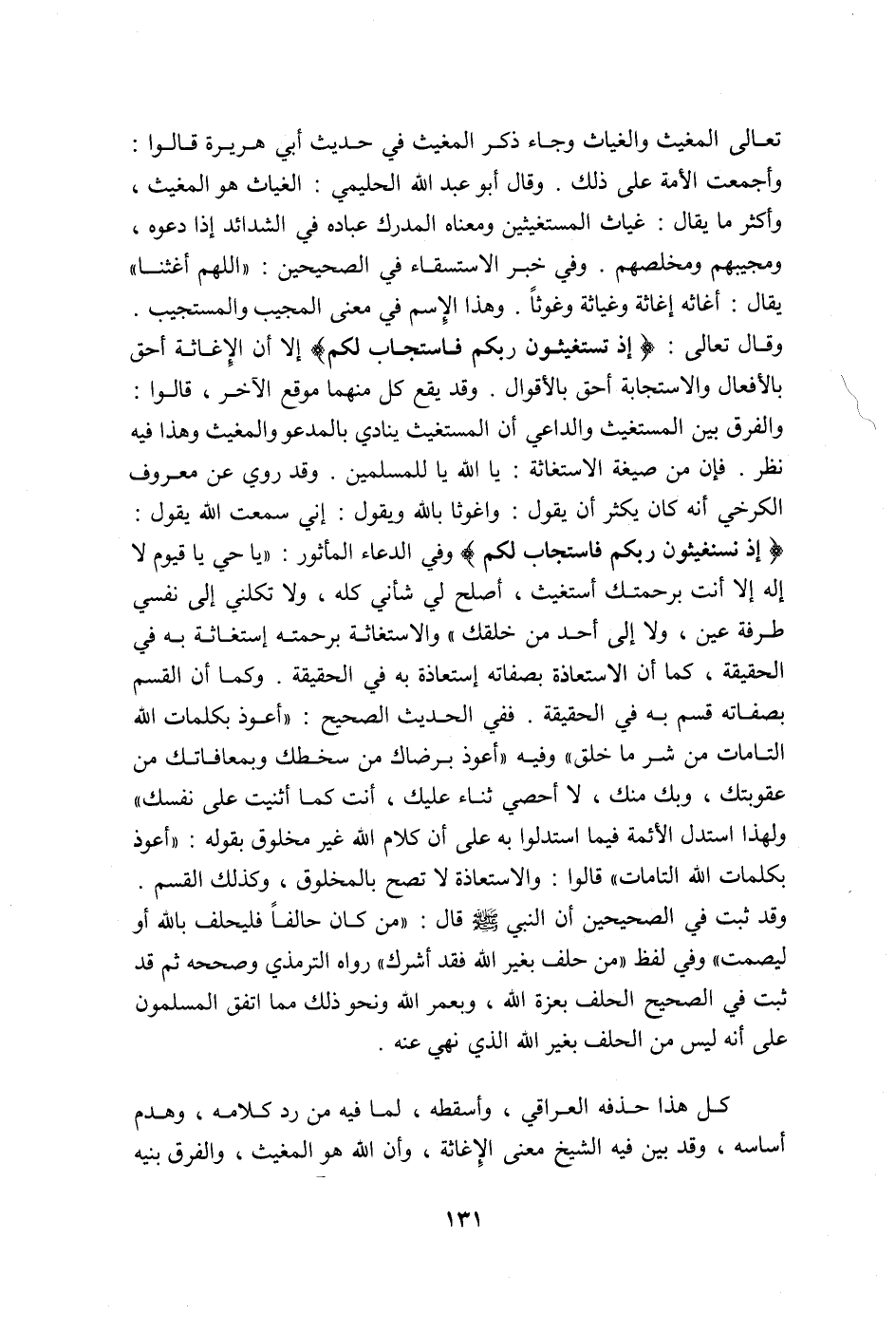كل هذا حذفه العراقي، وأسقطه، لما فيه من رد كلامه، وهدم أساسه، وقد بين فيه الشيخ معى الإغاثة، وأن الله هو المغيث، والفرق بينه