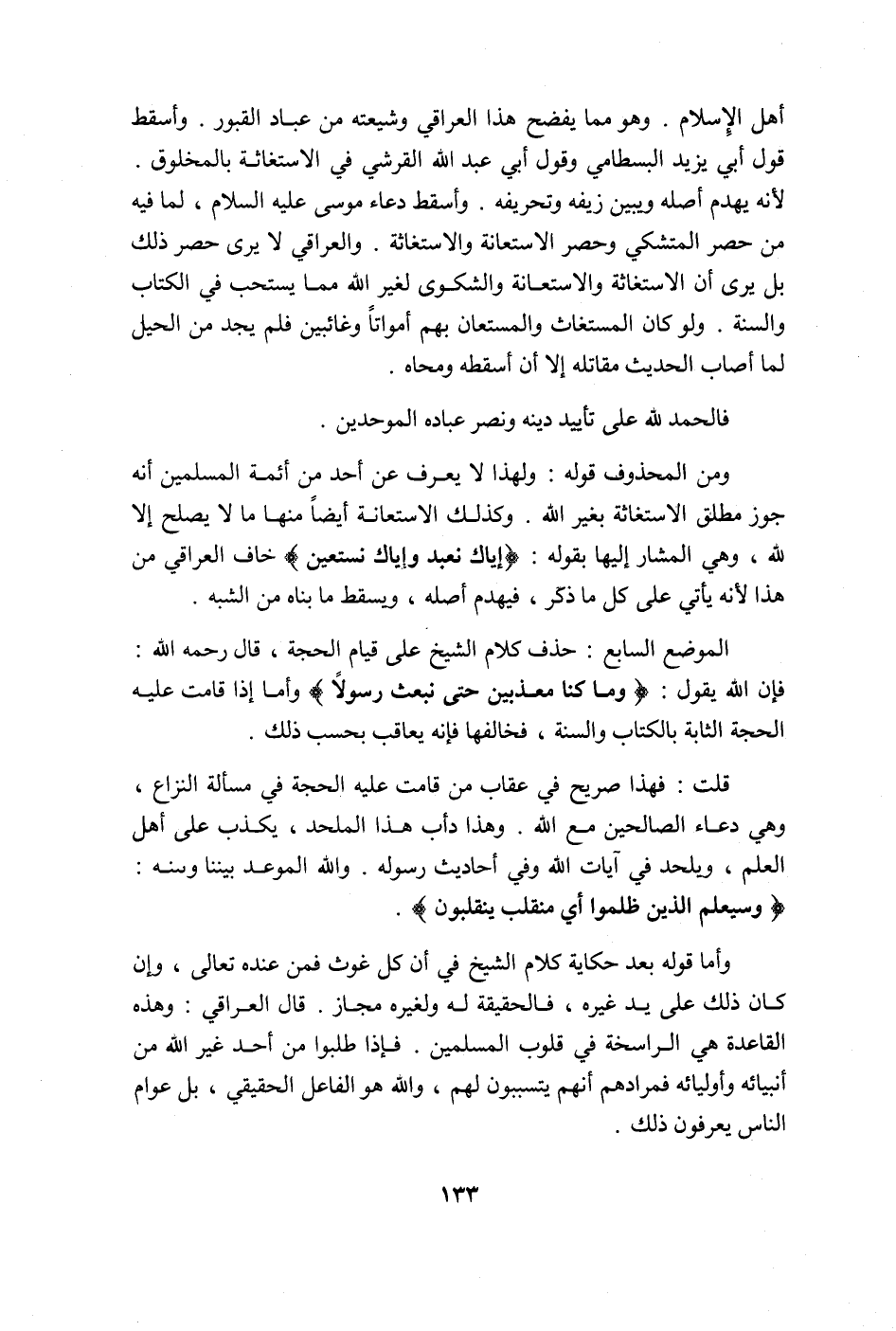 ومن المحذوف قوله: "ولهذا لا يعرف عن أحد من أئمة المسلمين أنه جوّز مطلق الاستغاثة بغير الله، وكذلك الاستعانة أيضاً منها ما لا يصلح إلا لله، وهي المشار إليها بقوله: {إِيَّاكَ نَعْبُدُ وَإِيَّاكَ نِسْتَعِينُ} خاف العراقي من هذا؛ لأنّه يأتي على كلّ ما ذكر، فيهدم أصله، ويسقط ما بناه من الشبه.