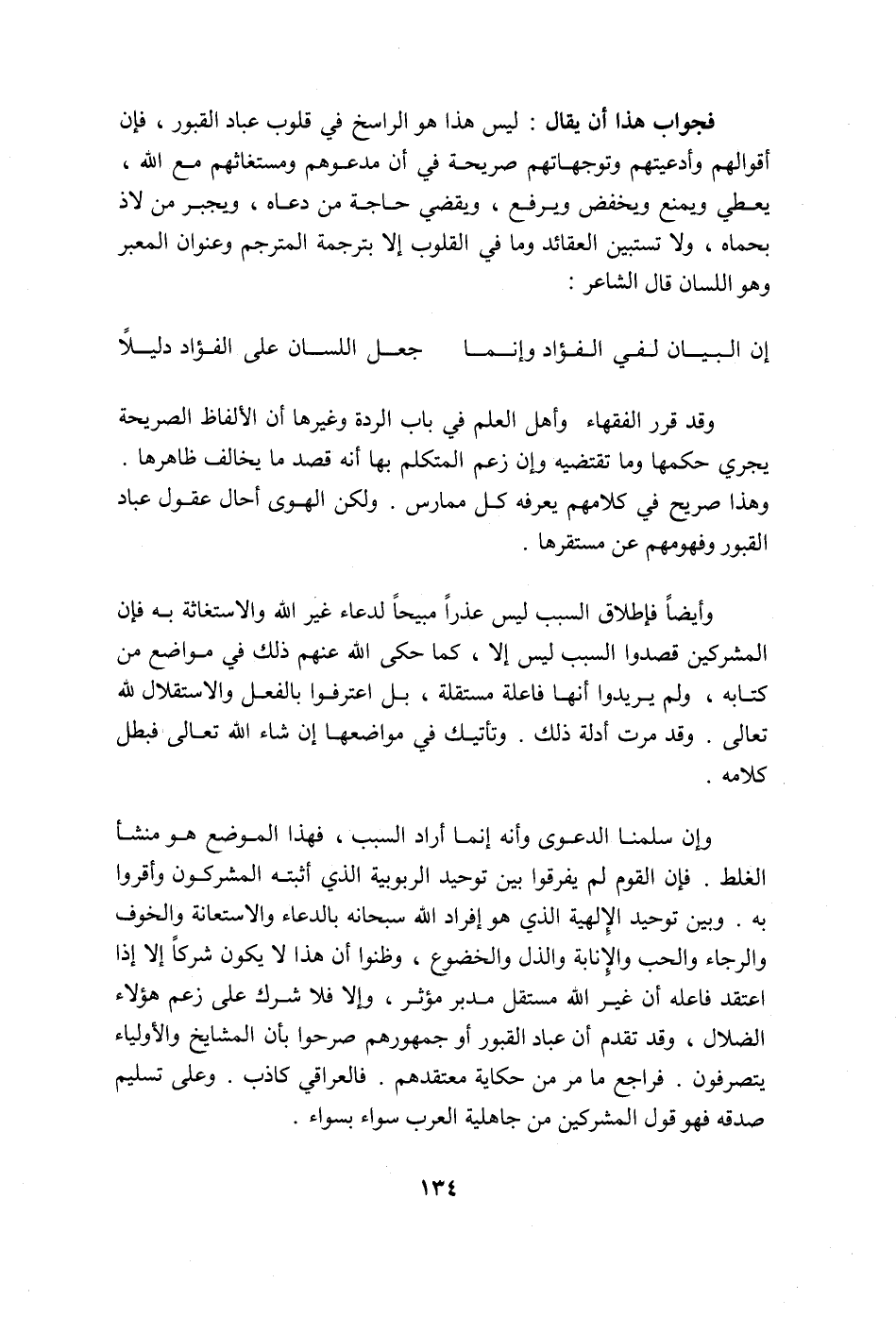 فجواب هذا أن يقال: ليس هذا هو الرّاسخ في قلوب عباد القبور، فإن أقوالهم وأدعيتهم وتوجهاتهم صريحة في أن مدعوهم ومستغاثهم مع الله يعطي ويمنع ويخفض ويرفع، ويقضي حاجة من دعاه، ويجبر من لاذ بحماه، ولا تستبين العقائد وما في القلوب إلا بترجمة المترجم وعنوان المعبر وهو اللسان، قال الشاعر: