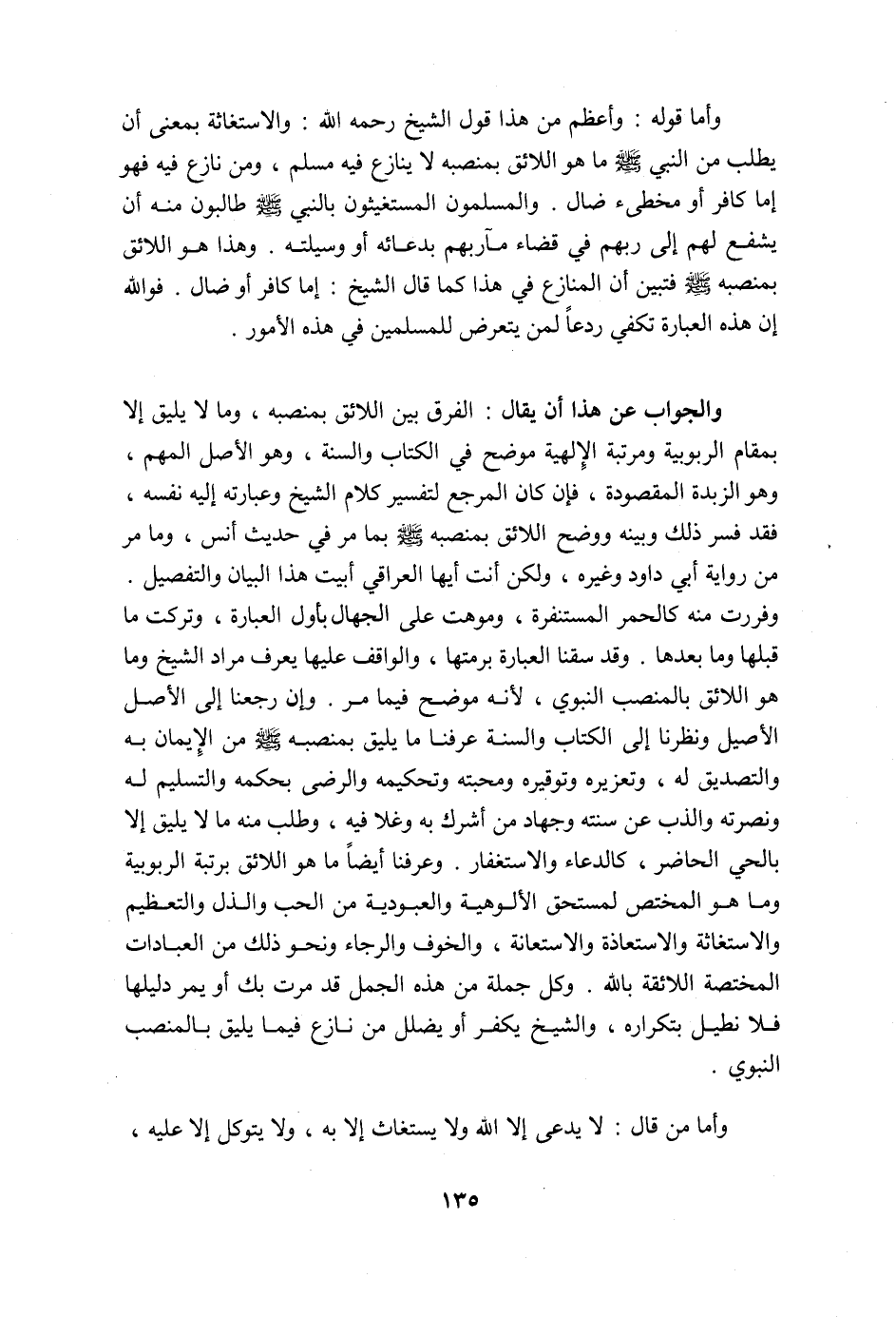 وفررت منه كالحمر المستنفرة، وموهت على الجهّال بأول العبارة، وتركت ما قبلها وما بعدها، وقد سقنا العبارة برمتها، والواقف عليها يعرف مراد الشيخ وما هو اللائق بالمنصب النبوي، لأنه موضح فيما مر. وإن رجعنا إلى الأصل الأصيل ونظرنا إلى الكتاب والسنة عرفنا ما يليق بمنصبه صلى الله عليه وسلّم من الإيمان به والتصديق له، وتعزيره وتوقيره ومحبته وتحكيمه والرضى بحكمه والتسليم له ونصرته والذّب عن سنته وجهاد من أشرك به وغلا فيه، وطلب منه ما لا يليق إلا بالحي الحاضر، كالدعاء والاستغفار، وعرفنا أيضاً ما هو اللائق برتبة الربوبية وما هو المختص لمستحق الألوهية والعبودية من الحب والذل والتعظيم والاستغاثة والاستعاذة والاستعانة، والخوف والرجاء ونحو ذلك من العبادات المختصة اللائقة بالله، وكل جملة من هذه الجمل قد مرت بك أو يمر دليلها فلا نطيل بتكراره، والشيخ يكفر أو يضلل من نازع فيما يليق بالمنصب النبوي.