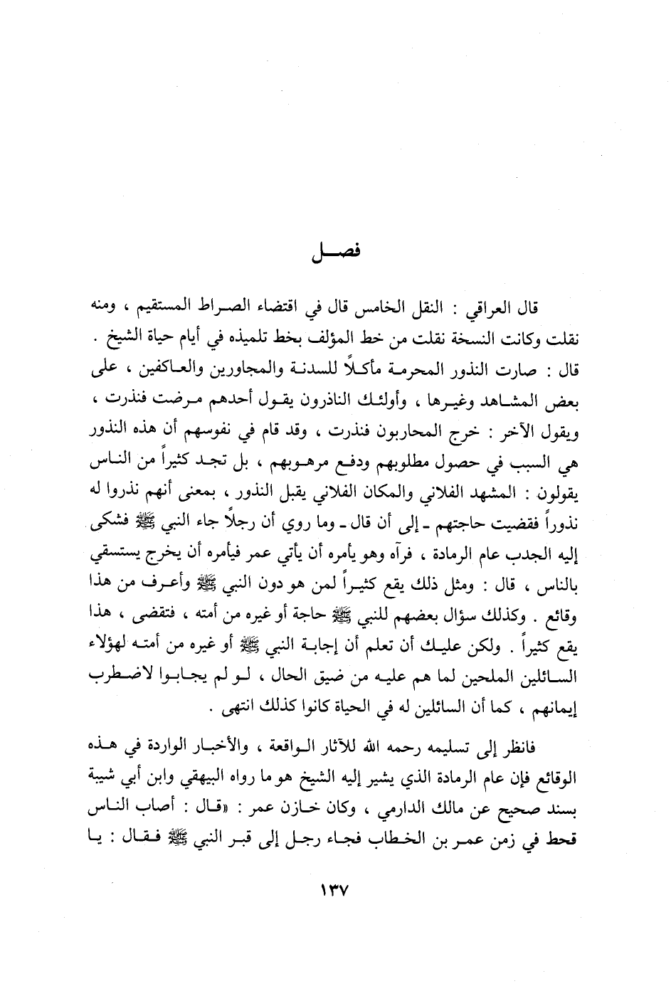 قال العراقي: النقل الخامس، قال في اقتضاء الصراط المستقيم: صارت النذور المحرمة مأكلاً للسدنة والمجاورين والعاكفين على بعض المشاهد وغيرها، وأولئك الناذرون يقول أحدهم: مرضت فنذرت، ويقول الآخر: خرج المحاربون فنذرت، وقد قام في نفوسهم أن هذه النذور هي السبب في حصول مطلوبهم ودفع مرهوبهم، بل تجد كثيرا من الناس يقولون: إن المشهد الفلاني والمكان الفلاني يقبل النذر بمعنى أنهم نذروا له نذوراً فقضيت حاجتهم ـ إلى أن قال ـ: وما روي أن رجلاً جاء النبي صلى الله عليه وسلم فشكى إليه الجدب عام الرمادة، فرآه وهو يأمره أن يأتي عمر فيأمره أن يخرج يستسقي بالناس، قال: ومثل هذا يقع كثيراً لمن هو دون النبي صلى الله عليه وسلم وأعرف من هذا وقائع. وكذلك سؤال بعضهم للنبي صلى الله عليه وسلم حاجة أو غيره من أمته، فتقضى هذا يوقع كثيراً. ولكن عليك أن تعلم أن إجابة النبي صلى الله عليه وسلم أو غيره من أمته لهؤلاء السائلين الملحين لما هم عليه من ضيق الحال لو لم يجابوا لاضطرب إيمانهم، كما أنّ السائلين له في الحياة كانوا كذلك" انتهى.