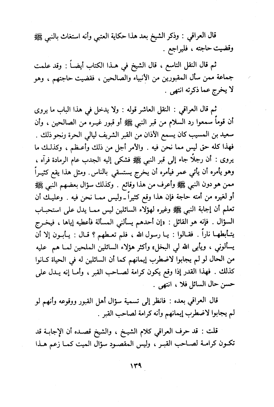 ثم قال العراقي: النقل العاشر قوله: " ولا يدخل في هذا الباب ما يروى من أنّ قوماً سمعوا رد السّلام من قبر النبي صلى الله عليه وسلم أو قبور غيره من الصالحين، وأن سعيد بن المسيب كان يسمع الأذان من القبر ليالي الحرة ونحو ذلك. فهذا كله حق ليس مما نحن فيه والأمر أجل من ذلك وأعظم، وكذلك ما يروى: أنّ رجلاً جاء إلى قبر النبي صلى الله عليه وسلم فشكى إليه الجدب عام الرّمادة، فرآه وهو يأمره أن يأتي عمر فيأمره أن يخرج يستسقي بالناس، ومثل هذا يقع كثيرا ممن هو دون النبي صلى الله عليه وسلم وأعرف من هذا وقائع. وكذلك سؤال بعضهم النبي صلى الله عليه وسلم أو لغيره من أمته حاجة فإن هذا قد وقع كثيراً ـ وليس هو مما نحن فيه. وعليك أن تعلم أن إجابة النبي صلى الله عليه وسلم وغيره لهؤلاء السائلين ليس مما يدل على استحباب السؤال؛ فإنه هو القائل: "إن أحدهم يسألني المسألة فأعطيه إياها فيخرج يتأبطها ناراً. فقالوا: يا رسول الله فلم تعطِهم؟ قال: يأبون إلا أن يسألوني، ويأبى الله لي البخل". وأكثر هؤلاء السائلين الملحين لما هم عليه من الحال لو لم يجابوا لاضطرب إيمانهم كما أن السائلين له في الحياة كانوا كذلك. فهذا القدر إذا وقع يكون كرامة لصاحب القبر، أما أنه يدل على حسن حال السائل فلا" انتهى.