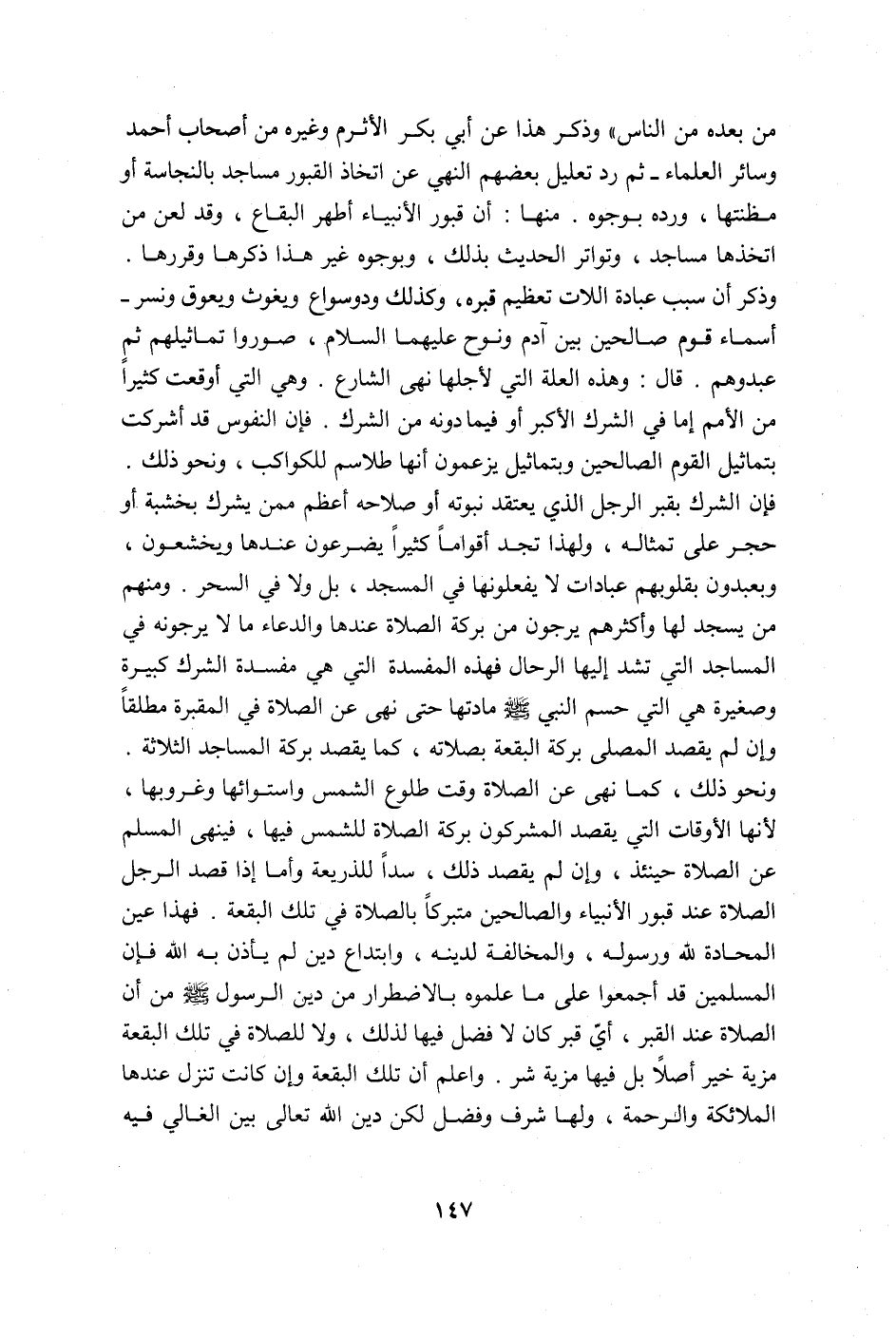 من بعده من الناس"، وذكر هذا عن أبي بكر الأثرم وغيره من أصحاب أحمد وسائر العلماء، ثم ردّ تعليل بعضهم النهي عن اتخاذ القبور مساجد بالنجاسة أو مظنتها، ورده بوجوه منها: أن قبور الأنبياء أطهر البقاع، وقد لعن من اتخذها مساجد، وتواتر الحديث بذلك، وبوجوه غير هذا ذكرها وقرّرها. وذكر أن سبب عبادة اللات تعظيم قبره، وكذلك ود وسواع ويغوث ويعوق ونسر أسماء قوم صالحين بين آدم ونوح عليهما السلام، وصوروا تماثيلهم ثم عبدوهم. قال: وهذه العلة التي لأجلها نهى الشارع، وهي التي أوقعت كثيراً من الأمم إما في الشرك الأكبر أو فيما دونه من الشرك؛ فإنّ النفوس قد أشركت بتماثيل القوم الصالحين وبتماثيل يزعمون أنها طلاسم للكواكب، ونحو ذلك. فإن يشرك بقبر الرجل الذي يعتقد نبوته أو صلاحه أعظم من أن يشرك بخشبة أو حجر على تمثاله؛ ولهذا تجد أقواماً كثيرين يضرعون عندها ويتخشعون ويعبدون بقلوبهم عبادة لا يفعلونها في المسجد بل ولا في السحر. ومنهم من يسجد لها وأكثرهم يرجون من بركة الصلاة عندها والدعاء ما لا يرجونه في المساجد التي تشد إليها الرحال، فهذه المفسدة التي هي مفسدة الشرك كبيره وصغيره هي التي حسم النبي صلى الله عليه وسلم مادتها حتى نهى عن الصلاة في المقبرة مطلقاً وإن لم يقصد المصلي بركة البقعة بصلاته، كما يقصد بصلاته بركة المساجد الثلاثة ونحو ذلك، كما نهى عن الصلاة وقت طلوع الشمس واستوائها وغروبها لأنها الأوقات التي يقصد المشركون بركة الصلاة للشمس فيها فنهى المسلم عن الصلاة حينئذ وإن لم يقصد ذلك سداً للذّريعة. وأما إذا قصد الرجل الصلاة عند قبور الأنبياء والصالحين متبركاً بالصّلاة في تلك البقعة فهذا عين المحادة لله ورسوله والمخالفة لدينه وابتداع دين لم يأذن به الله، فإن المسلمين قد أجمعوا على ما علموه بالاضطرار من دين الرسول صلى الله عليه وسلم من أن الصلاة عند القبر أي قبر كان لا فضل فيها لذلك ولا للصلاة في تلك البقعة مزية خير أصلاً بل مزية شر. واعلم أن تلك البقعة وإن كانت تنزل عندها الملائكة والرحمة، ولها شرف وفضل لكن دين الله تعالى بين الغالي فيه
