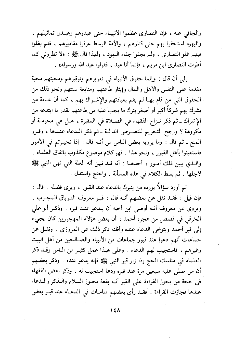 والجافي عنه، فإنّ النصارى عظموا الأنبياء حتى عبدوهم وعبدوا تماثيلهم، واليهود استخفوا بهم حتى قتلوهم، والأمة الوسط عرفوا مقاديرهم فلم يغلوا فيهم غلو النصارى ولم يجفوا عنهم جفاء اليهود؛ ولهذا قال صلى الله عليه وسلم: "لا تطروني كما أطرت النصارى ابن مريم، فإنما أنا عبد فقولوا عبد الله ورسوله". إلى أن قال: وإنما حقوق الأنبياء في تعزيرهم وتوقيرهم ومحبتهم محبة مقدمة على النفس والأهل والمال وإيثار طاعتهم ومتابعة سننهم ونحو ذلك من الحقوق التي من قام بها لم يقم بعبادتهم والإشراك بهم، كما أن عامة من يشرك بهم شركاً أكبر أو أصغر يترك ما يجب عليه من طاعتهم بقدر ما ابتدعه من الإشراك بهم ـ ثم ذكر نزاع الفقهاء في الصلاة في المقبرة، هل هي محرمة أو مكروهة؟ ورجّح التحريم للنصوص الدّالة، ثم ذكر الدعاء عندها وقرّر المنع ـ ثم قال: وما يرويه بعض الناس من أنه قال: "إذا تحيرتم في الأمور فاستعينوا بأهل القبور" ونحو هذا فهو كلام موضوع مكذوب باتفاق العلماء. والذي يبين ذلك أمور: أحدها: أنه قد تبين أن العلة التي نهى النبي صلى الله عليه وسلم لأجلها ـ ثم بسط الكلام في هذه المسألة، واحتج واستدل.