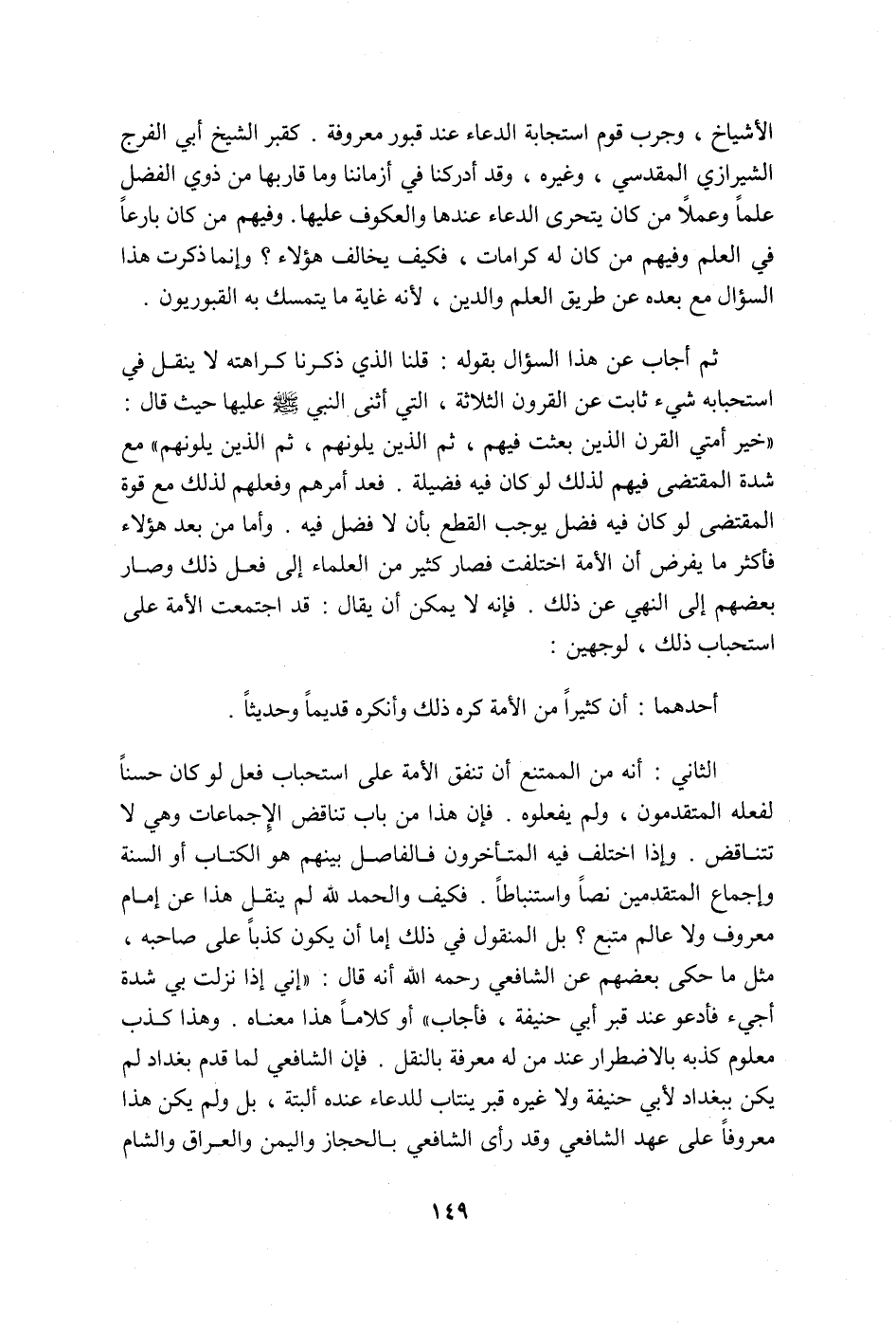 الأشياخ، وجرّب أقوام استجابة الدّعاء عند قبور معروفة كقبر الشيخ أبي الفرج الشيرازي المقدسي وغيره، وقد أدركنا في أزمامنا وما قاربها من ذوي الفضل علماً وعملاً من كان يتحرى الدعاء عندها والعكوف عليها، وفيهم من كان بارعاً في العلم وفيهم من له كرامات، فكيف يُخالَف هؤلاء؟ وإنما ذكرت هذا السؤال مع بعده عن طريق العلم والدين؛ لأنه غاية ما يتمسك به القبوريون".