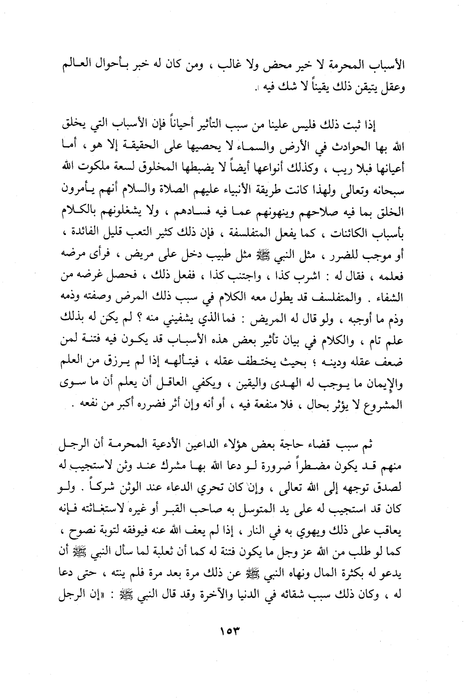 وإذا ثبت ذلك فليس علينا من سبب التأثير أحياناً فإن الأسباب التي يخلق الله بها الحوادث في الأرض والسماء لا يحصيها على الحقيقة إلا هو، أما أعيانها فيلا ريب، وكذلك أنواعها أيضا لا يضبطها المخلوق لسعة ملكوت الله سبحانه وتعالى؛ ولهذا كانت طريقة الأنبياء عليهم الصّلاة والسلام أنهم يأمرون الخلق بما فيه صلاحهم وينهونهم عما فيه فسادهم، ولا يشغلونهم بالكلام في أسباب الكائنات كما يفعل المتفلسفة فإن ذلك كثير التعب قليل الفائدة أو موجب للضرر، ومثل النبي صلى الله عليه وسلم مثل طبيب دخل على مريض فرأى مرضه فعلمه، فقال له: اشرب كذا، واجتنب كذا ففعل ذلك. فحصل غرضه من الشفاء. والمتفلسف قد يطول معه الكلام في سبب ذلك المرض وصفته وذمه وذم ما أوجبه ولو قال له المريض: فما الذي يشفيني منه؟ لم يكن له بذلك علم تام، والكلام في بيان تأثير بعض هذه الأسباب قد يكون فيه فتنة لمن ضعف عقله ودينه؛ بحيث يختطف عقله، فيتألهه إذا لم يرزق من العلم والإيمان ما يوجب له الهدى واليقين. ويكفي العاقل أن يعلم أن ما سوى المشروع لا يؤثر بحال فلا منفعة فيه أو أنه وإن أثر فضرره أكبر من نفعه.