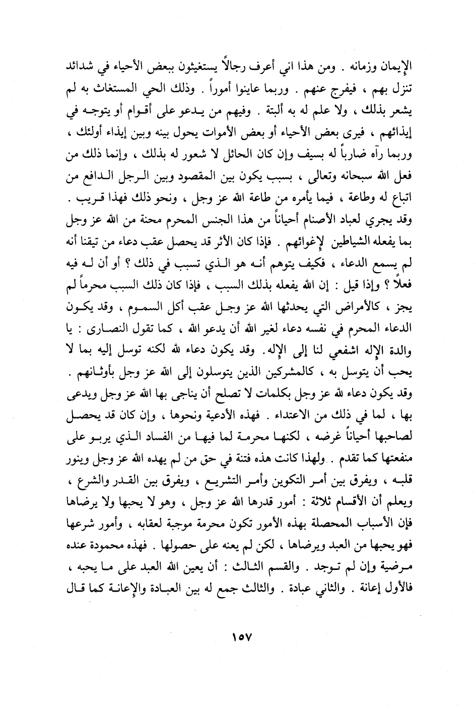 وقد يجري لعبّاد الأصنام أحياناً من هذا الجنس المحرم محنة من الله عزّ وجلّ بما يفعله الشياطين لأعوانهم فإذا كان الأثر قد يحصل عقب دعاء من يتيقنا أنه لم يسمع الدعاء، فكيف يتوهم أنه هو الذي تسبب في ذلك؟ أو أن له فيه فعلاً؟ وإذا قيل: إن الله يفعله بذلك السبب، فإذا كان ذلك السبب محرماً لم يجز كالأمراض التي يحدثها الله عز وجلّ عقب أكل السموم، وقد يكون الدّعاء المحرم في نفسه دعاء لغير الله أن يدعو الله، كما تقول النصارى: يا والدة الإله اشفعي لنا إلى الإله، وقد يكون دعاء لله لكنه توسل إليه بما لا يحب أن يتوسل به إليه، كما يفعل المشركون الذين يتوسلون إلى الله عز وجل بأوثانهم، وقد يكون دعاء لله عز وجل بكلمات لا تصلح أن يناجي بها الله عز وجل ويدعي بها، لما في ذلك من الاعتداء.