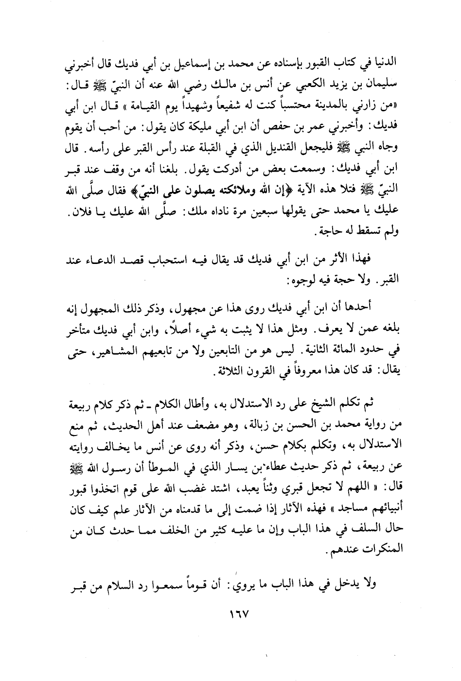 ثم تكلم الشيخ على ردّ الاستدلال به، وأطال الكلام ـ ثم ذكر كلام ربيعة من رواية محمد بن الحسن بن زبالة، وهو مضعف عند أهل الحديث، ثم منع الاستدلال به، وتكلم بكلام حسن، وذكر أنه روى عن أنس ما يخالف روايته عن ربيعة، ثم ذكر حديث عطاء بن يسار الذي في الموطأ أن رسول الله صلى الله عليه وسلّم قال: "اللهم لا تجعل قبري وثناً يعبد، اشتد غضب الله على قوم اتخذوا قبور أنبيائهم مساجد" فهذه الآثار إذا ضمت إلى ما قدمناه من الآثار علم كيف كان حال السلف في هذا الباب وإن ما عليه كثير من الخلف مما حدث كان من المنكرات عندهم.