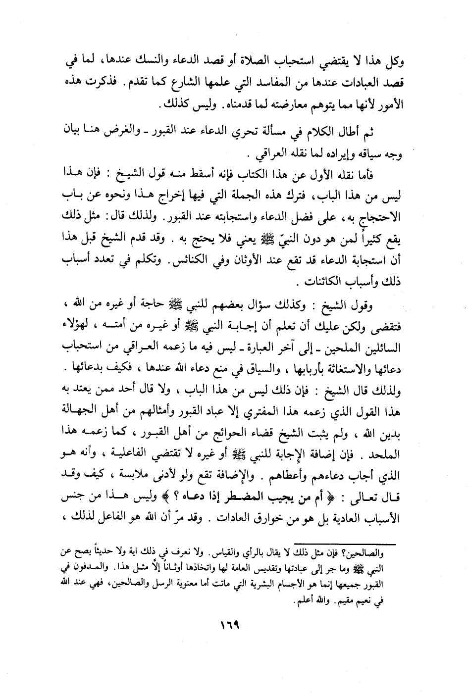 وقول الشيخ: "وكذلك سؤال بعضهم للنبي صلى الله عليه وسلّم حاجة أو غيره من الله، فتقضى ولكن عليك أن تعلم أن إجابة النبي صلى الله عليه وسلّم أو غيره من أمته لهؤلاء السائلين الملحين" إلى آخر العبارة، ليس فيه ما زعمه العراقي من استحباب دعائها والاستغاثة بأربابها، والسياق في منع دعاء الله عندها فكيف بدعائها. ولذلك قال الشيخ: "فإن ذلك ليس من هذا الباب" ولا قال أحد ممن يعتد به هذا القول الذي زعمه هذا المفتري إلا عباد القبور وأمثالهم من أهل الجهالة بدين الله، ولم يثبت الشيخ قضاء الحوائج من أهل القبور كما زعمه هذا الملحد؛ فإن إضافة الإجابة للنبي صلى الله عليه وسلّم أو غيره لا تقتضي الفاعلية، وأنه هو الذي أجاب دعاءهم وأعطاهم. والإضافة تقع ولو لأدنى ملابسة، كيف وقد قال تعالى: {أَمَّنْ يُجِيبُ الْمُضْطَرَّ إِذَا دَعَاهُ} (النمل: من الآية62) وليس هذا من جنس الأسباب العادية بل هو من خوارق العادات، وقد مرّ أن الله هو الفاعل لذلك،