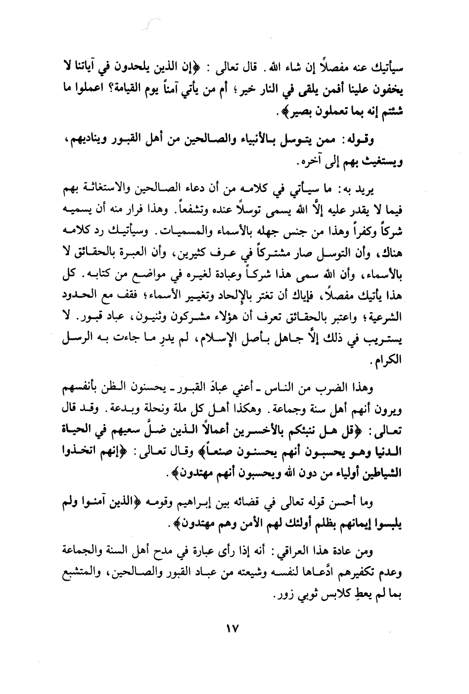 يريد به: ما سيأتي في كلامه من أن دعاء الصالحين والاستغاثة بهم فيما لا يقدر عليه إلا الله يسمى توسلاً عنده وتشفعاً. وهذا فرار منه أن يسميه شركاً وكفراً وهذا من جنس جهله بالأسماء والمسميات. وسيأتيك رد كلامه هناك، وأن التوسل صار مشتركا في عرف كثيرين، وأن العبرة بالحقائق لا بالأسماء، وأن الله سمى هذا شركاً وعبادة لغيره في مواضع من كتابه. كل هذا يأتيك مفصلا، فإياك أن تغتر بالإلحاد وتغيير الأسماء؛ فقف مع الحدود الشرعية، واعتبر بالحقائق تعرف أن هؤلاء مشركون وثنيون، عباد قبور. لا يستريب في ذلك إلاّ جاهل بأصل الإسلام لم يدر ما جاءت به الرسل الكرام.