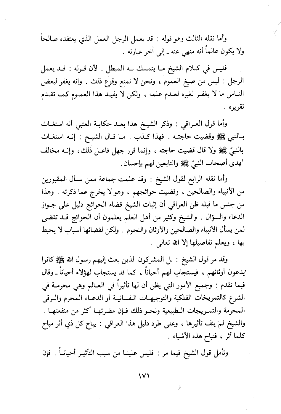 وأما نقله الرابع لقول الشيخ: وقد علمت جماعة ممن سأل المقبورين من الأنبياء والصالحين، وقضيت حوائجهم، وهو لا يخرج عما ذكرته، وهذا من جنس ما قبله ظن العراقي أن إثبات الشيخ قضاء الحوائج دليل على جواز الدعاء والسؤال. والشيخ وكثير من أهل العلم يعلمون أن الحوائج قد تقضى لمن يسأل الأنبياء والصالحين والأوثان والنجوم، ولكن لقضائها أسباب لا يحيط بها، ويعلم تفاصيلها إلا الله تعالى.