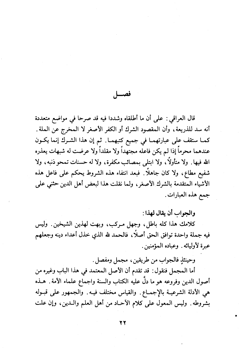 كما سنقف على عبارتهما في جميع كتبهما. ثم إن هذا الشرك إنما يكون عندهما محرماً إذا لم يكن فاعله مجتهداً ولا مقلداً ولا عرضت له شبهات يعذره الله فيها. ولا متأوّلاً، ولا ابتلى بمصائب مكفرة، ولا له حسنات تمحو ذنبه، ولا شفيع مطاع، ولا كان جاهلاً. فبعد انتفاء هذه الشروط يحكم على فاعل هذه الأشياء المتقدمة بالشرك الأصغر، ولما نقلت هذا لبعض أهل الدين حثني على جمع هذه العبارات.