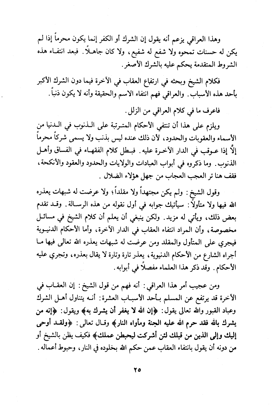 ومن عجيب أمر هذا العراقي: أنه فهم من قول الشيخ: إنّ العقاب في الآخرة قد يرتفع عن المسلم بأحد الأسباب العشرة: أنه يتناول أهل الشرك وعباد القبور والله تعالى يقول: {إِنَّ اللَّهَ لا يَغْفِرُ أَنْ يُشْرَكَ بِهِ} [النساء: من الآية48] ويقول: {إِنَّهُ مَنْ يُشْرِكْ بِاللَّهِ فَقَدْ حَرَّمَ اللَّهُ عَلَيْهِ الْجَنَّةَ وَمَأْوَاهُ النَّارُ} [المائدة: من الآية72] وقال تعالى: {وَلَقَدْ أُوحِيَ إِلَيْكَ وَإِلَى الَّذِينَ مِنْ قَبْلِكَ لَئِنْ أَشْرَكْتَ لَيَحْبَطَنَّ عَمَلُكَ} [الزمر: من الآية65] فكيف يظن بالشيخ أو من دونه أن يقول بانتفاء العقاب عمن حكم الله بخلوده في النار، وحبوط أعماله.