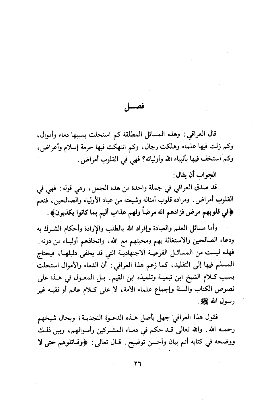 قد صدق العراقي في جملة واحدة من هذه الجمل، ,هي قوله: فهي في القلوب أمراض، ومراده قلوب أمثاله وشيعته من عباد الأولياء والصالحين، فنعم {فِي قُلُوبِهِمْ مَرَضٌ فَزَادَهُمُ اللَّهُ مَرَضاً وَلَهُمْ عَذَابٌ أَلِيمٌ بِمَا كَانُوا يَكْذِبُونَ} .
