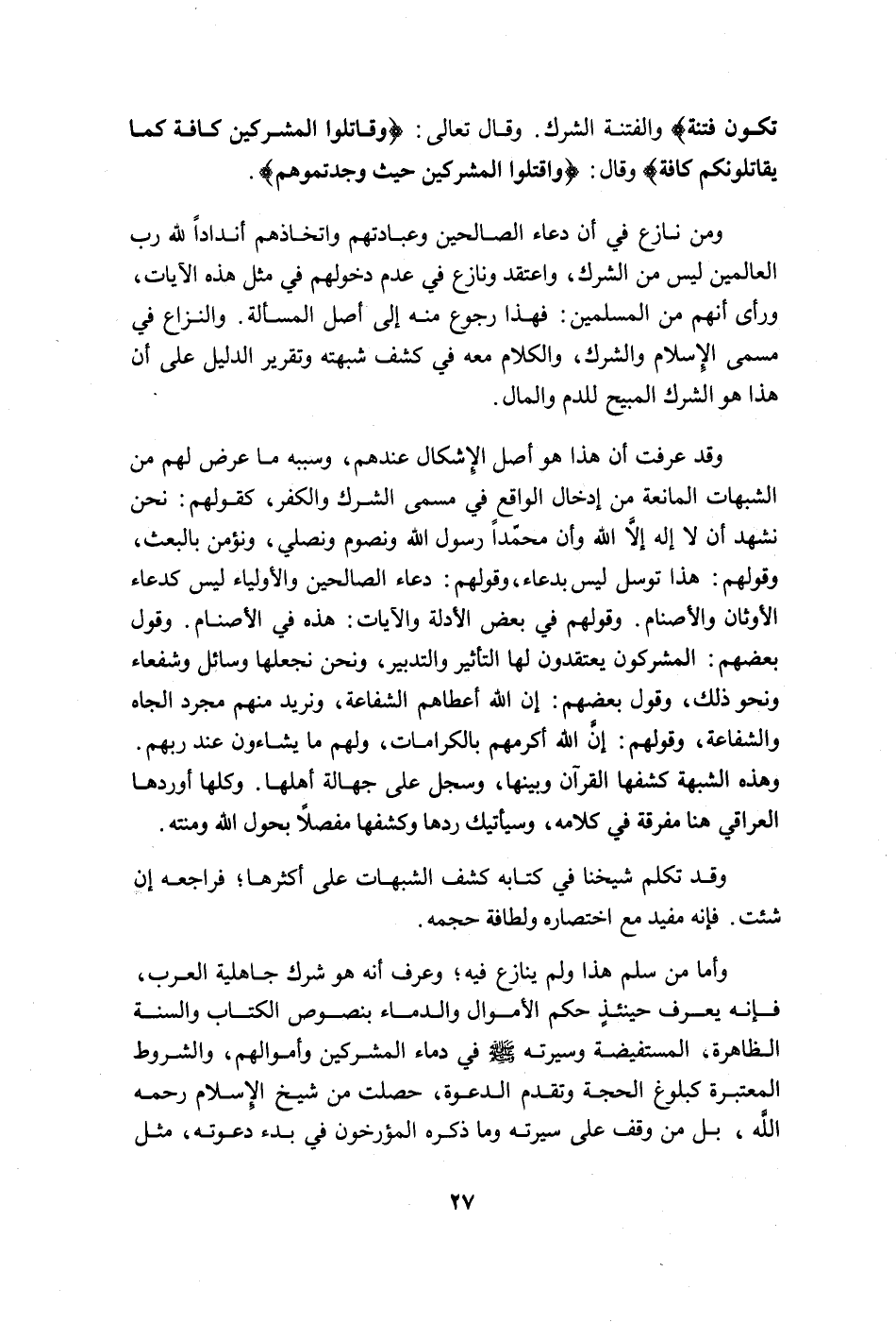 ومن نازع في أن دعاء الصالحين وعبادتهم واتخاذهم أنداداً لله رب العالمين ليس من الشرك، واعتقد ونازع في عدم دخولهم في مثل هذه الآيات، ورأى أنهم من المسلمين: فهذا رجوع منه إلى أصل المسألة. والنزاع في مسمى الإسلام والشرك، والكلام معه في كشف شبهته وتقرير الدليل على أن هذا هو الشرك المبيح للدم والمال.