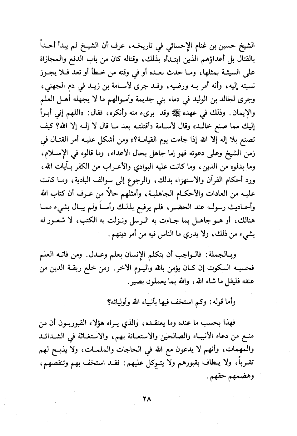 الشيخ حسين بن غنام الإحسائي في تاريخه، عرف أن الشيخ لم يبدأ أحداً بالقتال بل أعداؤهم الذين ابتدأه بذلك، وقتاله كان من باب الدفع والمجازاة على السيئة بمثلها، وما حدث بعده أو في وقته من خطأ أو تعد فلا يجوز نسبته إليه، وأنه أمر به ورضيه، ,قد جرى لأسامة بن زيد في دم الجهني، وجرى لخالد بن الوليد في دماء بني جذيمة وأموالهم ما يجهله أهل العلم والإيمان. وذلك في عهده صلى الله عليه وسلّم وقد برئ منه وأنكره، فقال: "اللهم إني أبرأ إليك مما صصنع خالد" وقال لأسامة: "أقتلته بعد ما قال: لا إله إلا الله؟ كيف تصنع بلا إله إلا الله إذا جاءت يوم القيامة" ومن أشكل عليه أمر القتال في زمن الشيخ وعلى دعوته فهو إما جاهل بحال الأعداء وما قالوه في الإسلام، وما بدلوه من الدين، وما كانت عليه البوادي والأعراب من الكفر بآيات الله، ورد أحكام القرآن والاستهزاء بذلك، والرجوع إلى سوالف البادية، وما كانت عليه من العادات والأحكام الجاهلية، وأمثلهم حالاً من عرف أن كتاب الله وأحاديث رسوله عند الحضر، فلم يرفع بذلك رأساً ولم يبال بشيء مما هنالك، أو هو جاهل بما جاءت به الرسل ونزلت به الكتب، لا شعور له بشيء من ذلك، ولا يدري ما الناس فيه من أمر دينهم.