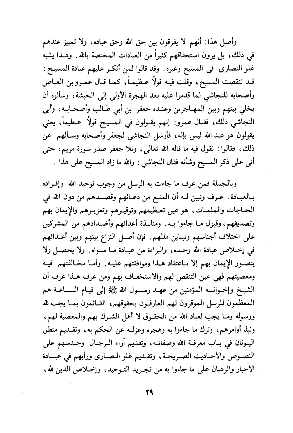 وبالجملة فمن عرف ما جاءت به الرسل من وجوب توحيد الله وإفراده بالعبادة، عرف وتبين له أن المنع من دعائهم وقصدهم من دون الله في الحاجات والملمات، هو عين تعظيمهم وتوقيرهم وتعزيرهم والإيمان بهم وتصديقهم، وقبول ما جاءوا به، ومنابذة أعدائهم وأضدادهم من المشركين على اختلاف أجناسهم وتباين مللهم. فإن أصل النزاع بينهم وبين أعدائهم في إخلاص عبادة الله وحده، والبراءة من عبادة ما سواه. ولا يحصل ولا يتصور الإيمان بهم إلا باعتقاد هذا وموافقتهم عليه. وأما مخالفتهم فيه ومعصيتهم فهي عين التنقيص لهم والاستخفاف بهم ومت عرف هذا عرف أن الشيخ وإخوانه المؤمنين من عهد رسول الله صلى الله عليه وسلّم إلى قيام الساعة هم المعظّمون للرسل الموقرون لهم العارفون بحقوقهم، القائمون بما يجب لله ورسوله وما يجب لعباده الله من الحقوق لا أهل الشرك بهم والمعصية لهم، ونبذ أوامرهم، وترك ما جاءوا به وهجره وعزله عن الحكم به، وتقديم منطق اليونان في باب معرفة الله وصفاته، وتقديم آراء الرجال وحدسهم على النصوص والأحاديث الصريحة، وتقديم غلو النصارى ورأيهم في عبادة الأحبار والرهبان على ما جاءوا به من تجريد التوحيدن وإخلاص الدين لله،