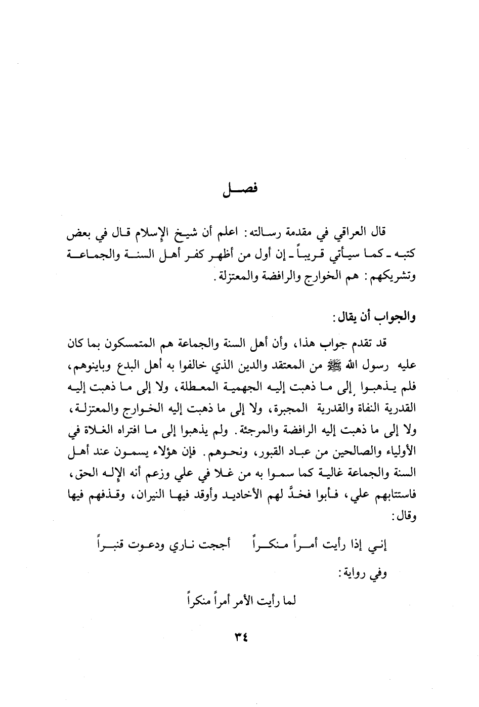 قال العراقيّ في مقدمة رسالته: اعلم أن شيخ الإسلام قال في بعض كتبه ـ كما سيأتي قريباً ـ إن أول من أظهر كفر أهل السنة والجماعة وتشريكهم: هم الخوارج والرافضة والمعتزلة.