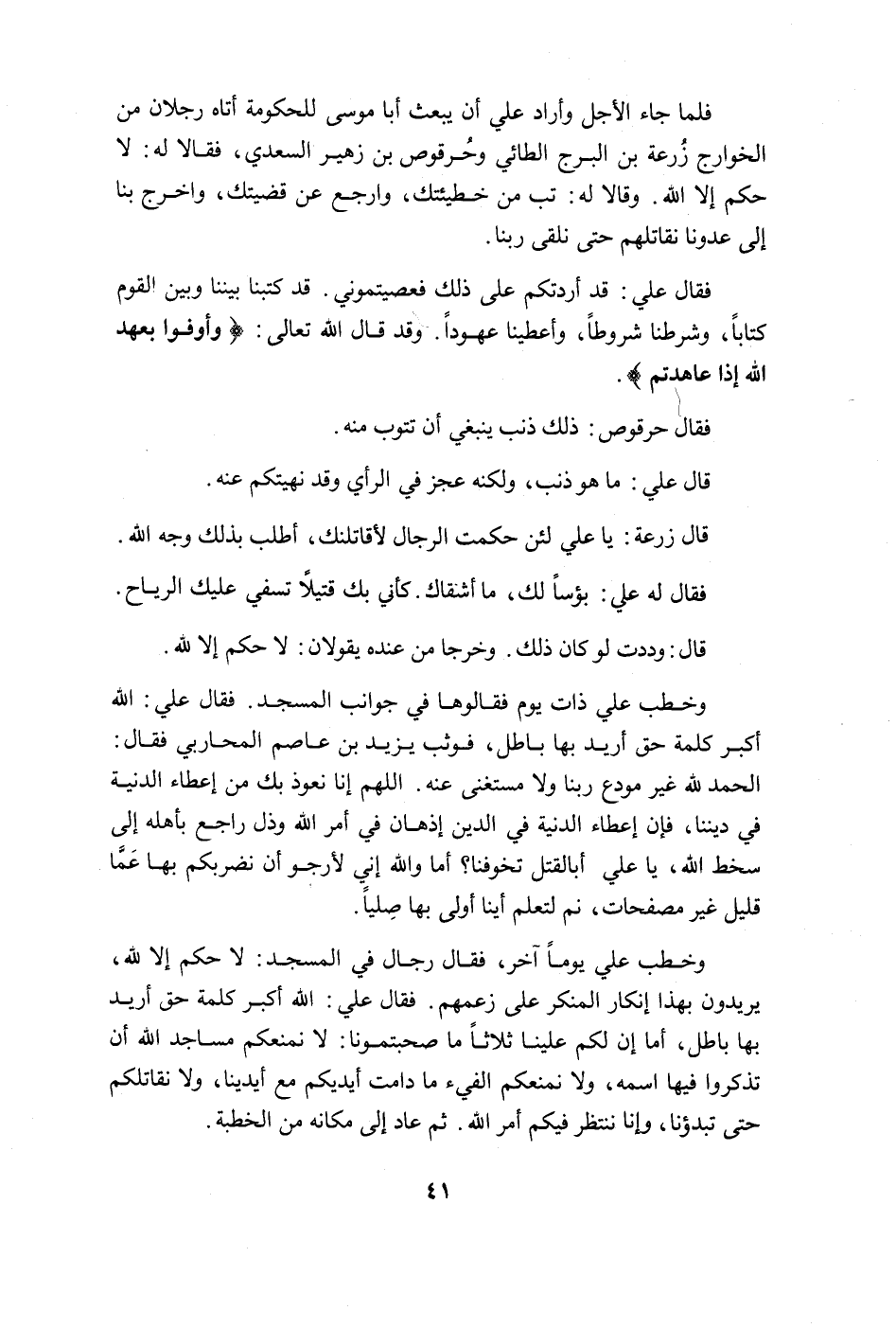 وخطب علي يوما آخر، فقال رجال في المسجد: لا حكم إلا لله، يريدون بهذا إنكار المنكر على زعمهم. فقال علي: الله أكبر كلمة حق أريد بها باطل، أما إن لكم علينا ثلاثاً ما صحبتمونا: لا نمنعكم مساجد الله أن تذكروا فيها اسمه، ولا نمنعكم الفيء ما دامت أيديكم مع أيدينا، ولا نقاتلكم حتى تبدؤنا، وإنا ننتظر فيكم أمر الله. ثم عاد إلى مكانة من الخطبة.