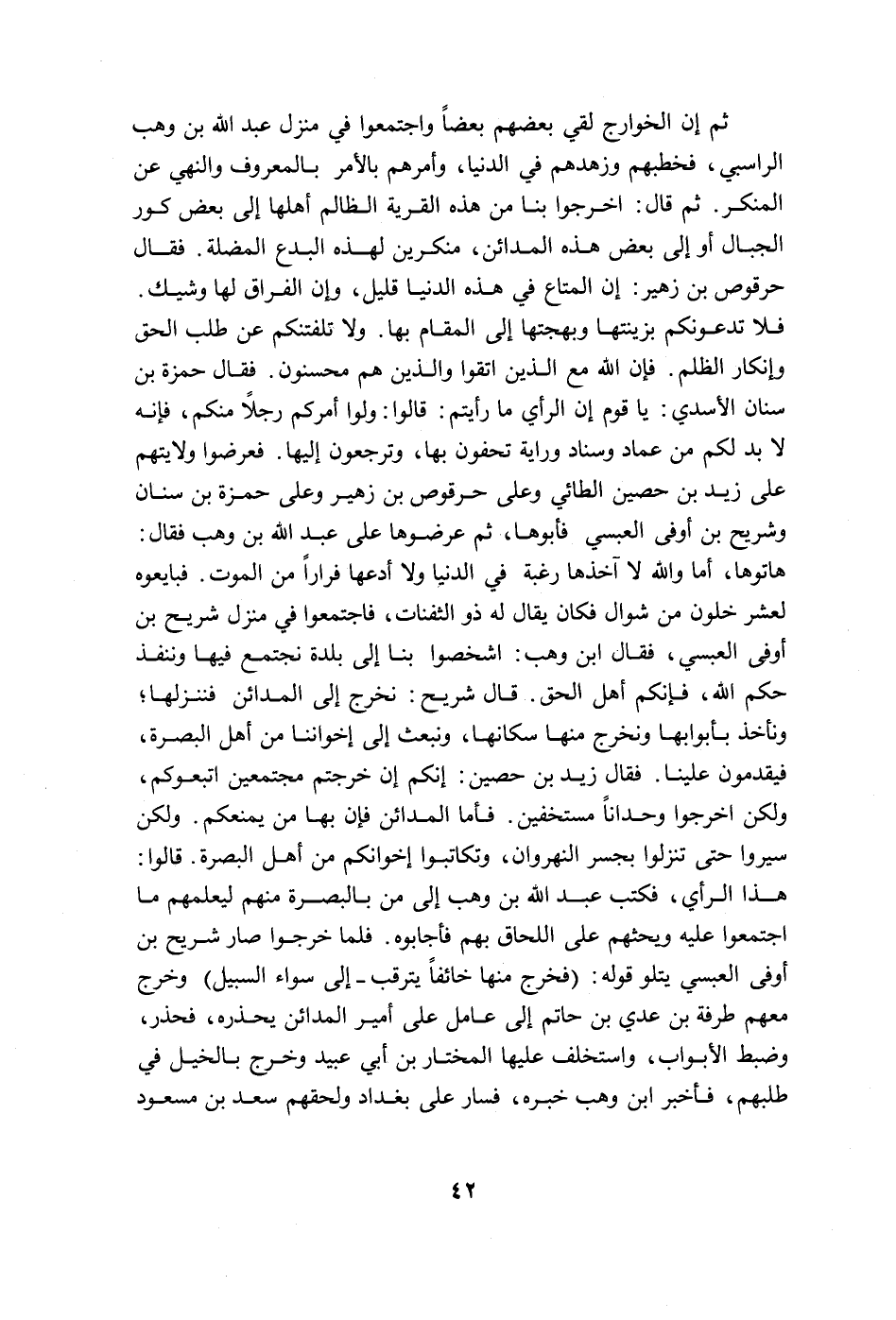 ثم إن الخوارج لقي بعضهم بعضاً واجتمعوا في منزل عبد الله بن وهب الراسبيّ، فخطبهم وزهّدهم في الدّنيا، وأمرهم بالأمر بالمعروف والنهي عن المنكر، ثم قال: اخرجوا بنا من هذه القرية الظالم أهلها إلى بعض كور الجبال أو إلى بعض هذه المدائن، منكرين لهذه البدع المضلة. فقال حرقوص بن زهير: إن المتاع في هذه الدنيا قليل، وإن الفراق لها وشيك. فلا تدعونكم بزينتها وبهجتها إلى المقام بها. ولا تلفتنكم عن طلب الحق وإنكار الظلم. فإن الله مع الذين اتقوا والذين هم محسنون. فقال حمزة بن سنان الأسدي: يا قوم إن الرّأي ما رأيتم: قالوا: ولوا أمركم رجلاً منكم، فإنه لا بد لكم من عماد وسناد وراية تحفون بها وترجعون إليها. فعرضوا ولايتهم على زيد بن حصين الطائي وعلى حرقوص بن زهير وعلى حمزة بن سنان وشريح بن أوفى العبسي فأبوها، ثم عرضوها على عبد الله بن وهب فقال: هاتوها، أما والله لا آخذها رغبة في الدنيا ولا أدعها فراراً من الموت. فبايعوه لعشر خلون من شوال فكان يقال له ذو الثفنات، فاجتمعوا في منزل شريح بن أوفى العبسيّ، فقال ابن وهب: اشخصوا بنا إلى بلدة نجتمع فيها وننفذ حكم الله، فإنكم أهل الحق. قال شريح: نخرج إلى المدائن فننزلها؛ ونأخذ بأبوابها ونخرج منها سكانها، ونبعث إلى إخواننا من أهل البصرة فيقدمون علينا، فقال زيد بن حصين: إنكم إن خرجتم مجتمعين اتبعوكم، ولكن اخرجوا وحداناً مستخفين. فأما المدائن فإن بها من يمنعكم، ولكن سيروا حتى تنزلوا بجسر النهروان، وتكاتبوا إخوانكم من أهل البصرة. قالوا: هذا الرأي، فكتب عبد الله بن وهب إلى من بالبصرة منهم ليعلمهم ما اجتمعوا عليه ويحثهم على اللحاق بهم فأجابوه. فلما خرجوا صار شريح بن أوفى العبسي يتلو قوله: {فَخَرَجَ مِنْهَا خَائِفاً يَتَرَقَّبُ} إلى {سَوَاءَ السَّبِيلِ} وخرج معهم طرفة بن عدي بن حاتم إلى عامل على أمير المدائن يحذره، فحذر، وضبط الأبواب، واستخلف عليها المختار بن أبي عبيد وخرج بالخيل في طلبهم، فأخبر ابن وهب خبره، فسار على بغداد ولحقهم سعد بن مسعود