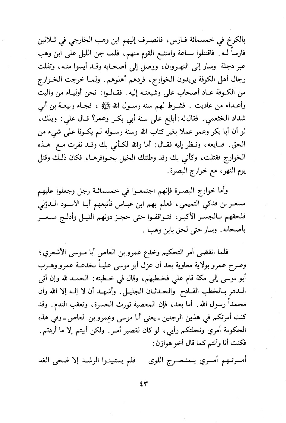 بالكرخ في خمسمائة فارس، فانصرف إليهم ابن وهب الخارجي في ثلاثين فارساً له. فاقتتلوا ساعة وامتنع القوم منهم، فلما جن الليل على ابن وهب عبر دجلة وسار إلى النهروان، وصل إلى أصحابه وقد أيسوا منه، وتفلت رجال أهل الكوفة يريدون الخوارج، فردهم أهلوهم. ولما خرجت الخوارج من الكوفة عاد أصحاب علي وشيعته إليه. فقالوا: نحن أولياء من واليت وأعداء من عاديت. فشرط لهم سنة رسول الله صلى الله عليه وسلّم، فجاء ربيعة بن أبي شداد الخثعمي. فقال له: أبايع على سنة أبي بكر وعمر؟ فقال علي: ويلك، لو أن أبا بكر وعمر عملا بغير كتاب الله وسنة رسوله لم يكونا على شيء من الحق، فبايعه، ونظر إليه فقال: أما والله لكأني بك قد نفرت مع هذه الخوارج فقتلت، وكأني بك قد وطئتك الخيل بحوافرها، فكان ذلك وقتل يوم النهر مع خوارج البصرة.