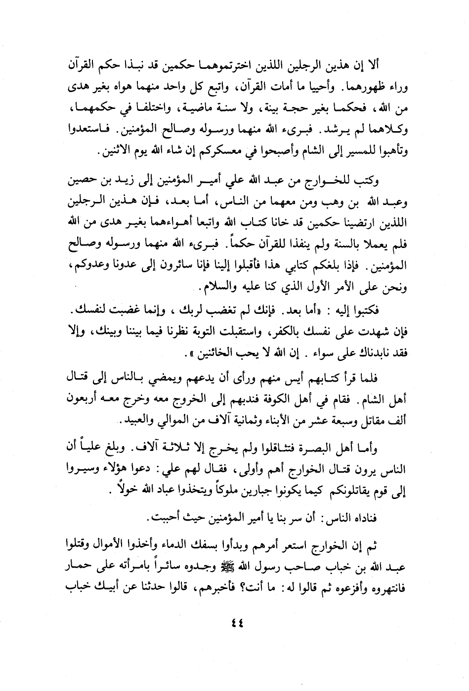 وكتب للخوارج من عبد الله علي أمير المؤمنين إلى زيد بن حصين وعبد الله بن وهب ومن معهما من الناس، أما بعد، فإن هذين الرجلين اللذين ارتضينا حكمين قد خانا كتاب الله واتبعا أهواءهما بغير هدى من الله فلم يعملا بالسنة ولم ينفذا للقرآن حكماً. فبرئ الله منهما ورسوله وصالح المؤمنين. فإذا بلغكم كتابي هذا فأقبلوا إلينا فإنا سائرون إلى عدونا وعدوكم، ونحن على الأمر الأول الذي كنا عليه والسلام.
