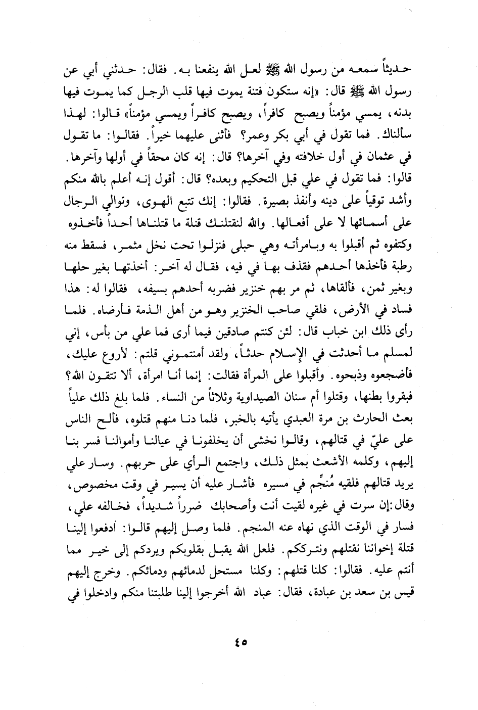 حديثاً سمعه من رسول الله صلى الله عليه وسلّم لعل الله ينفعنا به. فقال: حدثني أبي عن رسول الله صلى الله عليه وسلّم قال: "إنه ستكون فتنة يموت فيها قلب الرجل كما يموت فيها بدنه، يمسي مؤمناً ويصبح كافراً، ويصبح كافراً ويمسي مؤمناً" قالوا: لهذا سألناك. فما تقول في أبي بكر وعمر؟ فأثنى عليهما خيراً، فقالوا: ما تقول في عثمان في أول خلافته وفي آخرها؟ قال: إنه كان محقاً في أولها وآخرها. وأشد توقيّاً على دينه وأنفذ بصيرة، فقالوا: إنك تتبع الهوى، وتوالي الرجال على أسمائها لا على أفعالها، والله لنقتلنك قتلة ما قتلناها أحداً، فأخذوه وكتفوه ثم أقبلوا به وبامرأته وهي حبلى فنزلوا تحت نخل مثمر، فسقط منه رطبة فأخذها أحدهم فقذف بها في فمه، فقال له آخر: أخذتها بغير حلها وبغير ثمن، فألقاها، ثم مر بهم خنزير فضربهم أحدهم بسيفه، فقالوا له: هذا فساد في الأرض، فلقي صاحب الخنزير وهو من أهل الذمة فأرضاه، فلما ذلك ابن خباب قال: لئن كنتم صادقين فيما رأى فما علي من بأس، إني لمسلم ما أحدثت في الإسلام حدثاً، ولقد أمنتموني قلتم: لا روع عليك، فأضجعوه وذبحوه، وأقبلوا على المرأة فقالت: إنما أنا امرأة، ألا تتقون الله؟ فبقروا بطنه وقتلوا أم سنان الصيداوية وثلاثاً من النساء، فلما بلغ ذلك عليّاً بعث الحارث بن مرة العبدي يأتيه بالخبر فلما دنا منهم قتلوه، فألح الناس على عليّ في قتالهم، وقالوا: نخشى أن يخلفونا في عيالنا وأموالنا فسر بنا إليهم، وكلمه الأشعث بمثل ذلك، واجتمع الرأي على حربهم، وسار علي يريد قتالهم فلقيه منجم في مسيره فأشار عليه أن يسير في وقت مخصوص، وقال: إن سرت في غيره لقيت أنت وأصحابك ضرراً شديداً، فخالفه علي، فسار في الوقت الذي نهاه عنه المنجم. فلما وصل إليهم قالوا: ادفعوا إلينا قتلة إخواننا نقتلهم ونترككم. فلعل الله يقبل بقلوبكم ويردكم إلى خير مما أنتم عليه. فقالوا: كلنا قتلهم: وكلنا مستحل لدمائهم ودمائكم. وخرج إليهم قيس بن سعد بن عبادة، فقال: عباد الله أخرجوا إلينا طلبتنا منكم وادخلوا في