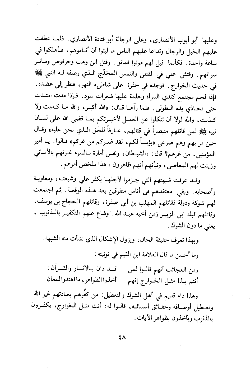 وقد عرفت شبهتهم التي جزموا لأجلها بكفر علي وشيعته، ومعاوية وأصحابة، وبقي معتقدهم في أناس متفرقين بعد هذه الوقعة، ثم اجتمعت لهم شوكة ودولة فقاتلهم المهلب بن أبي صفرة، وقاتلهم الحجاج بن يوسف، وقاتلهم قبله ابن الزبير زمن أخيه عبد الله، وشاع عنهم التكفير بالذنوب، يعني ما دو نالشرك.
