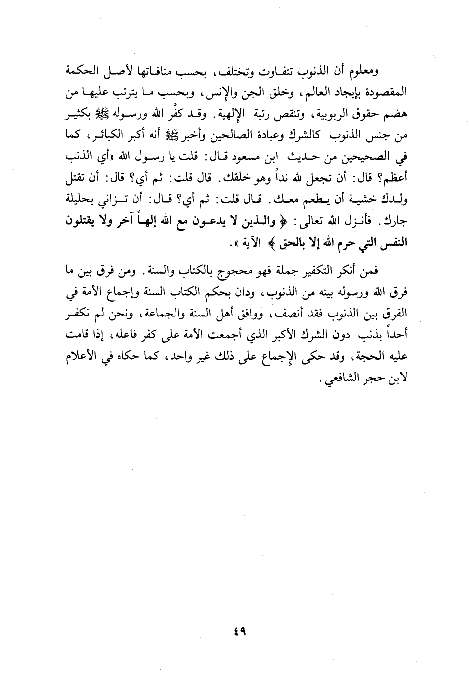فمن أنكر التكفير جملة فهو محجوج بالكتاب والسنة. ومن فرّق بين ما فرّق الله ورسوله بينه من الذنوب، ودان بحكم الكتاب والسنة وإجماع الأمة في الفرق بين الذنوب فقد أنصف، ووافق أهل السنة والجماعة، ونحن لم نكفر أحداً بذنب دون الشرك الأكبر الذي أجمعت الأمة على كفر فاعله، إذا قامت عليه الحجّة، وقد حكى الإجماع على ذلك غير واحد، كما حكاه في الأعلام لابن حجر الشافعي.