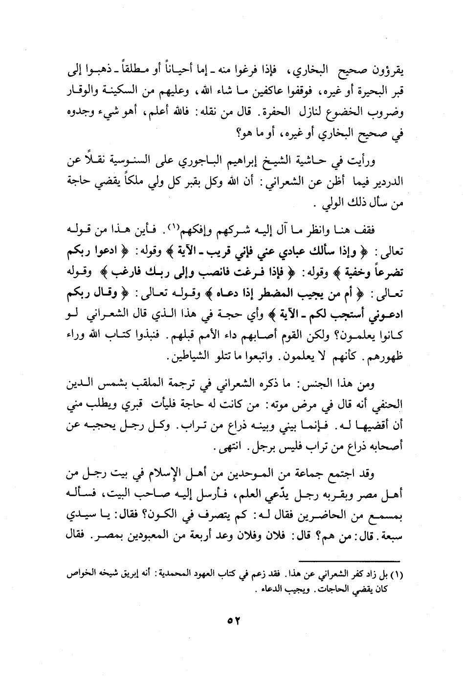 (1) بل زاد كفر الشعراني عن هذا، فقد زعم في كتاب العهود المحمدية: أنه إبريق شيخه الخواص كان يقضي الحاجات، ويجيب الدعاء.