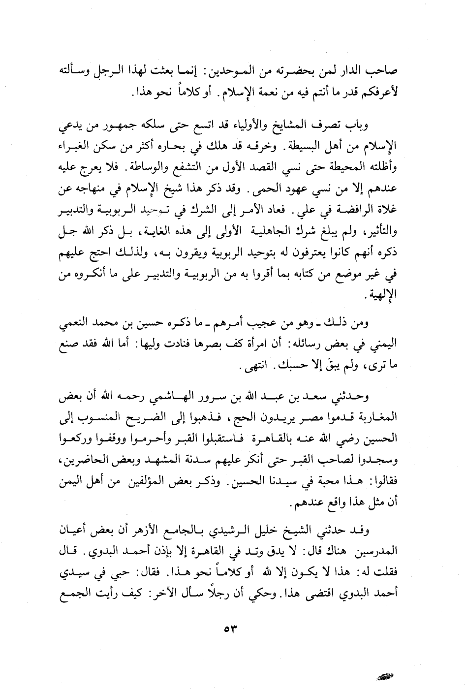 وحدثني سعد بن عبد الله بن سرور الهاشمي رحمه الله أن بعض المغاربة قدموا مصر يريدون الحجّ، فذهبوا إلى الضريح المنسوب إلى الحسين رضي الله عنه بالقاهرة فاستقبلوا القبر وأحرموا ووقفوا وركعوا وسجدوا لصاحب القبر حتى أنكر عليهم سدنة المشهد وبعض الحاضرين، فقالوا: هذا محبة في سيدنا الحسين. وذكر بعض المؤلفين من أهل اليمن أن مثل هذا واقع عندهم.