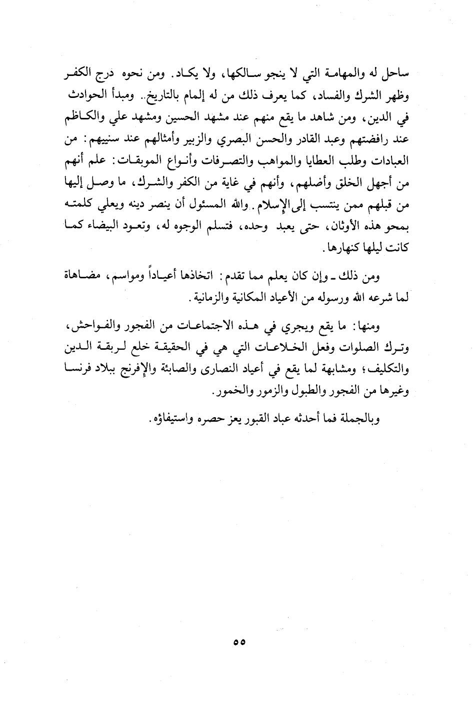ساحل له والمهامة التي لا ينجو يالكها، ولا يكاد، ومنحوه درح الكفر وظهر الشرك والفساد، كما يعرف ذلك من له إلمام بالتاريخ. ومبدأ الحوادث في الدين، ومن شاهد ما يقع منهم عند مشهد الحسين ومشهد علي والكاظم عند رافضتهم وعبد القادر والحسن البصريّ، والزبير وأمثالهم عند سنييهم: من العبادات وطلب العطايا والمواهب والتصرفات وأنواع الموبقات: علم أنهم من أجهل الخلق وأضلهم، وأنهم في غاية من الكفر والشرك، ما وصل إليها من قبلهم ممن ينتسب إلى الإسلام. والله المسئول أن ينصر دينه ويعلي كلمته بمحو هذه الأوثان، حتى يعبد وحده، فتسلم الوجوه له، وتعود البيضاء كانت ليلها كنهارها.