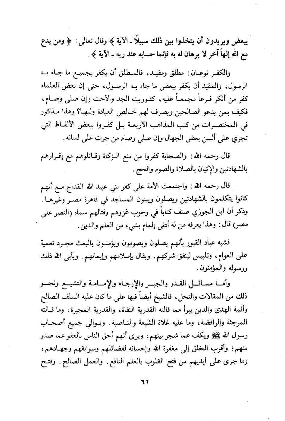 وأما مسائل القدر والجبر والإرجاء والإمامة والتشيع ونحو ذلك من المقالات والنحل، فالشيخ أيضاً فيها على ما كان عليه السلف الصالح وأئمة الهدى والدين يبرأ مما قالته القدرية النفاة، والقدرية المجبرة، وما قالته المرجئة والرافضة، وما عليه غلاة الشيعة والناصبة. ويوالي جميع أصحاب رسول الله صلى الله عليه وسلّم ويكف عما شجر بينهم، ويرى أنهم أحق الناس بالعفو عما صدر منهم؛ وأقرب الخلق إلى مغفرة الله وإحسانه لفضائلهم وسوابقهم وجهادهم، وما جرى على أيديهم من فتح القلوب بالعلم النافع. والعمل الصالح. وفتح