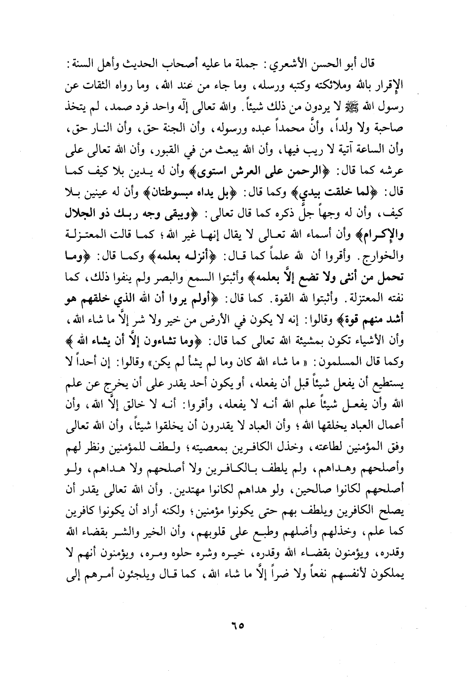 قال أبو الحسن الأشعري: جملة ما عليه أصحاب الحديث وأهل السنة: الإقرار بالله وملائكته وكتبه ورسله، وما جاء من عند الله، وما رواه الثقات عن رسول الله صلى الله عليه وسلّم لا يردون من ذلك شيئاً. والله تعالى إله واحد فرد صمد، لم يتخذ صاحبة ولا ولداً، وأنّ محمداً عبده ورسوله، وأن الجنة حق، وأن النار حق، وأن الساعة آتية لا ريب فيها، وأن الله يبعث من في القبور، وأن الله تعالى على عرشه كما قال: {الرَّحْمَنُ عَلَى الْعَرْشِ اسْتَوَى} [طه:5] ، وأن له يدين بلا كيف كما قال: {لِمَا خَلَقْتُ بِيَدَيَّ} [صّ: من الآية75] ، وكما قال: {بَلْ يَدَاهُ مَبْسُوطَتَانِ} [المائدة: من الآية64] ، وأن له عينين بلا كيف، وأن له وجهاً جلّ ذكره كما قال تعالى: {وَيَبْقَى وَجْهُ رَبِّكَ ذُو الْجَلالِ وَالْأِكْرَامِ} [الرحمن:27] ، وأن أسماء الله تعالى لا يقال إنها غير الله، كما قالت المعتزلة والخوارج، وأقروا أن لله علماً كما قال: {أَنْزَلَهُ بِعِلْمِهِ} [النساء: من الآية166] ، وكما قال: {وَمَا تَحْمِلُ مِنْ أُنْثَى وَلا تَضَعُ إِلَّا بِعِلْمِهِ} [فاطر: من الآية11] ، وأثبتوا السمع والبصر ولم ينفوا ذلك، كما نفته المعتزلة، وأثبتوا لله القوة، كما قال: {أَوَلَمْ يَرَوْا أَنَّ اللَّهَ الَّذِي خَلَقَهُمْ هُوَ أَشَدُّ مِنْهُمْ قُوَّةً} [فصلت: من الآية15] وقالوا: إنه لا يكون في الأرض من خير ولا شر إلا ما شاء الله، وأن الأشياء تكون بمشيئة الله تعالى، كما قال: {وَمَا تَشَاءُونَ إِلَّا أَنْ يَشَاءَ اللَّهُ} [الانسان: من الآية30] ، وكما قال المسلمون: "ما شاء الله كان وما لم يشأ لم يكن" وقالوا: إن أحداً لا يستطيع أن يفعل شيئاً علم الله أنه لا يفعله، أو يكون أحد يقدر على أن يخرج عن علم الله، وأن يفعل شيئاً علم الله أنه لا يفعله، وأقروا: أنه لا خالق إلا الله، وأن أعمال العباد يخلقها الله، وأن العباد لا يقدرون أن يخلقوا شيئاً، وأن الله تعالى وفق المؤمنين لطاعته، وخذل الكافرين بمعصيته، ولطف للمؤمنين ونظر لهم وأصلحهم وهداهم، ولم يلطف بالكافرين ولا أصلحهم ولا هداهم، ولو أصلحهم لكانوا صالحين، ولو هداهم الكانوا مهتدين. وأن الله تعالى يقدر أن يصلح الكافرين ويلطف بهم حتى يكونوا مؤمنين، ولكنه أراد أن يكونوا كافرين كما علم، وخذلهم وأضلهم وطبع على قلوبهم، وأن الخير والشر بقضاء الله وقدره، ويؤمنون بقضاء الله وقدره، خيره وشره، حلوه ومره، ويؤمنون أنهم لا يملكون لأنفسهم نفعاً ولا ضراً إلا ما شاء الله، كما قال ويلجئون أمرهم إلى