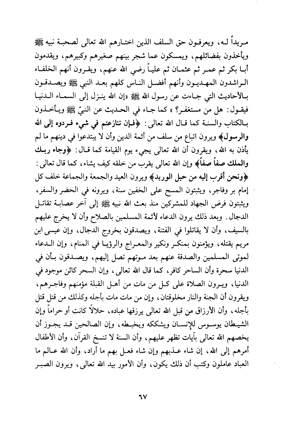 مريداً له، ويعرفون حق السلف الذين اختارهم الله تعالى لصحبة نبيه صلى الله عليه وسلّم ويأخذون بفضائلهم، ويمسكون عما شجر بينهم صغيرهم وكبيرهم، ويقدمون أبا بكر ثم عمر ثم عثمان ثم علياً رضي الله عنهم، ويقرون أنهم الخلفاء الراشدون المهديون وأنهم أفضل الناس كلهم بعد النبي صلى الله عليه وسلّم ويصدقون بالأحاديث التي جاءت عن رسول الله صلى الله عليه وسلّم "إن الله ينزل إلى السماء الدنيا فيقول: هل من مستغفر؟ " كما جاء في الحديث عن النّبيّ صلى الله عليه وسلّم ويأخذون بالكتاب والسنة كما قال الله تعالى: {فَإِنْ تَنَازَعْتُمْ فِي شَيْءٍ فَرُدُّوهُ إِلَى اللَّهِ وَالرَّسُولِ} [النساء: من الآية59] ويرون اتباع من سلف من أئمة الدين وأن لا يبتدعوا في دينهم ما لم يأذن به الله، ويقرون أن الله تعالى يجيئ يوم القيامة كمال قال: {وَجَاءَ رَبُّكَ وَالْمَلَكُ صَفّاً صَفّاً} [الفجر:22] ، وإن الله تعالى يقرب من خلقه كيف يشاء، كما قال تعالى: {وَنَحْنُ أَقْرَبُ إِلَيْهِ مِنْ حَبْلِ الْوَرِيدِ} [قّ: من الآية16] ويرون العيد والجمعة والجماعة خلف كل إمام بر وفاجر، ويثبتون المسح على الخفين سنة، ويرونه في الحضر والسفر، ويثبتون فرض الجهاد للمشركين منذ بعث الله نبيه صلى الله عليه وسلّم إلى آخر عصابة تقاتل الدجال. وبعد ذلك يرون الدعاء لأئمة المسلمين بالصلاح وأن لا يخرج عليهم بالسيف، وأن لا يقاتلوا في الفتنة، ويصدقون بخروج الدجال، وإن عيسى ابن مريم يقتله، ويؤمنون بمنكر ونكير والمعراج والرؤيا في المنام، وإن الدعاء لموتى المسلمين والصدقة عنهم بعد موتهم تصل إليهم، ويصدقون بأن في الدنيا سحرة وأن الساحر كافر، كما قال الله تعالى، وإن السحر كائن موجود في الدنيا، ويرون الصلاة على كل من مات بأجله وكذلك من قتل قتل بأجله، وأن الأرزاق من قبل الله تعالى يرزقها عباده، حلالاً كانت أو حراماً وإن الشياطين يوسوس للإنسان ويشككه ويخبطه، وإن الصالحين قد يجوز أن يخصهم الله تعالى بآيات تظهر عليهم، وأن السنة لا تنسخ القرآن، وأن الأطفال أمرهم إلى الله، إن شاء عذبهم وإن شاء فعل بهم ما أراد، وأن الله عالم ما العباد عاملون وكتب أن ذلك يكون، وأن الأمور بيد الله تعالى، ويرون الصبر