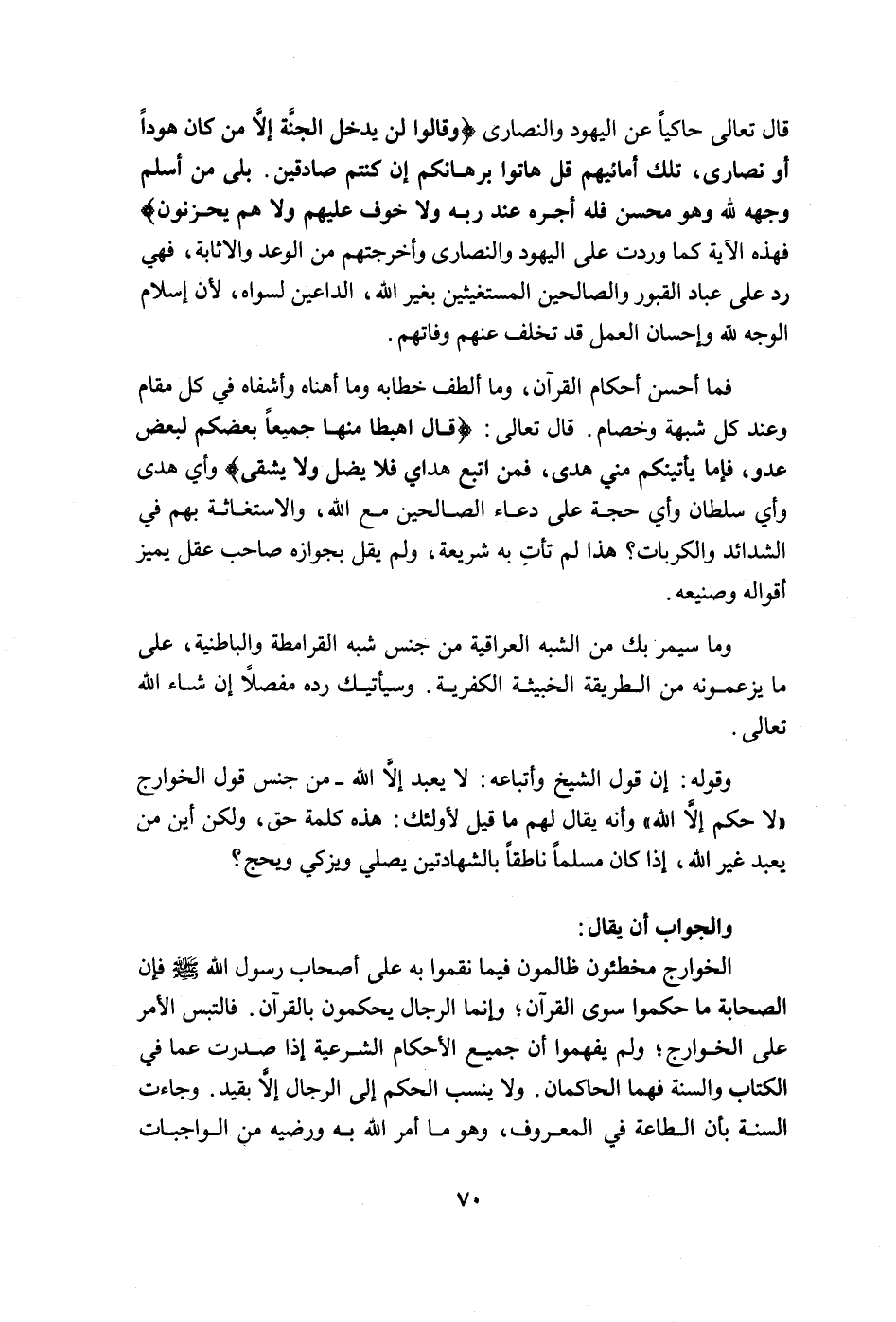 قال تعالى حاكيا عن اليهود والنصارى {وَقَالُوا لَنْ يَدْخُلَ الْجَنَّةَ إِلَّا مَنْ كَانَ هُوداً أَوْ نَصَارَى تِلْكَ أَمَانِيُّهُمْ قُلْ هَاتُوا بُرْهَانَكُمْ إِنْ كُنْتُمْ صَادِقِينَ، بَلَى مَنْ أَسْلَمَ وَجْهَهُ لِلَّهِ وَهُوَ مُحْسِنٌ فَلَهُ أَجْرُهُ عِنْدَ رَبِّهِ وَلا خَوْفٌ عَلَيْهِمْ وَلا هُمْ يَحْزَنُونَ} [البقرة:111ـ112] فهذه الآية كما وردت على اليهود والنصارى وأخرجتهم من الوعد والإثابة، فهي رد على عباد القبور والصالحين المستغيثين بغير الله، الداعين لسواه، لأن إسلام الوجه لله وإحسان العمل قد تخلف عنهم وفاتهم.