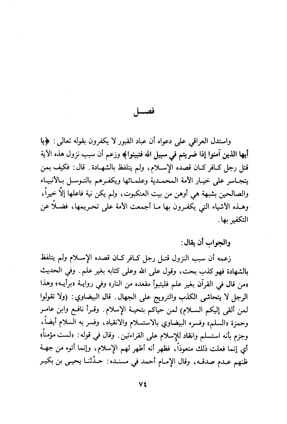 واستدل العراقي على دعواه أن عباد القبور لا يكفرون بقوله تعالى: {يَا أَيُّهَا الَّذِينَ آمَنُوا إِذَا ضَرَبْتُمْ فِي سَبِيلِ اللَّهِ فَتَبَيَّنُوا} (النساء: من الآية94) ، وزعم أن سبب نزول هذه الآية قتل رجل كافر كان قصده الإسلام، ولم يتلفظ بالشهادة. قال: فكيف بمن يتجاسر على خيار الأمة المحمدية وعلمائها ويكفرهم بالتوسل بالأنبياء والصالحين بشبهة هي أوهى من بيت العنكبوت، ولم يكن نية فاعلها إلا خيراً، وهذه الأشياء التي يكفرون بها ما أجمعت الأمة على تحريمها، فضلاً عن التكفير بها.