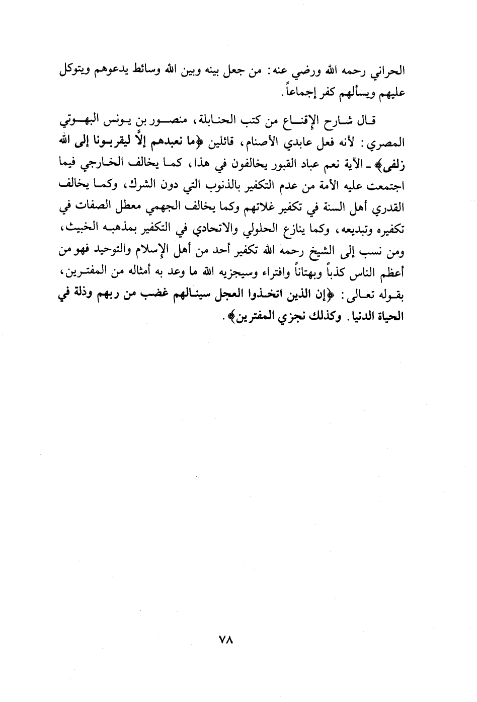 قال شارح الإقناع من كتب الحنابلة منصور بن يونس البهوتي المصريّ: لأنه فعل عابدي الأصنام، قائلين: {مَا نَعْبُدُهُمْ إِلَّا لِيُقَرِّبُونَا إِلَى اللَّهِ زُلْفَى} الآية (الزمر: من الآية3) ، نعم عباد القبور يخالفون في هذا، كما يخالف الخارجيّ فيما اجتمعت عليه الأمة من عدم التكفير بالذنوب التي دون الشرك، وكما يخالف القدري أهل السنة في تكفير غلاتهم، وكما يخالف الجهمي معطل الصفات في تكفيره وتبديعه، وكما ينازع الحلولي والاتحادي في التكفير بمذهبه الخبيث، ومن نسب إلى الشيخ رحمه الله تكفير أحد من أهل الإسلام والتوحيد فهو من أعظم الناس كذباً وبهتاناً وافتراءً وسيجزيه الله ما وعد به أمثاله من المفترين، بقوله تعالى: {إِنَّ الَّذِينَ اتَّخَذُوا الْعِجْلَ سَيَنَالُهُمْ غَضَبٌ مِنْ رَبِّهِمْ وَبذِلَّةٌ فِي الْحَيَاةِ الدُّنْيَا وَكَذَلِكَ نَجْزِي الْمُفْتَرِينَ} (لأعراف:152) .
