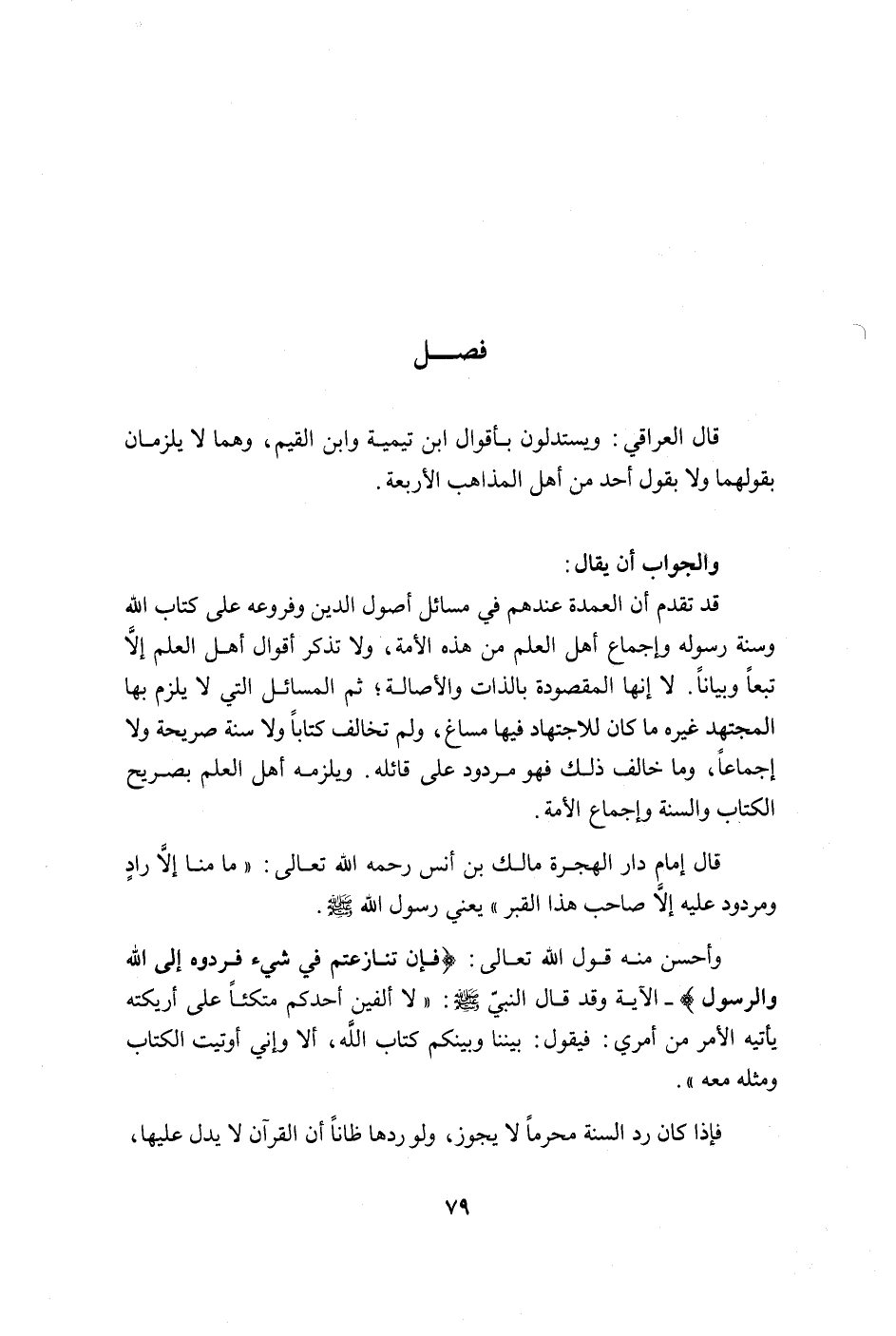 وأحسن منه قول الله تعالى: {فَإِنْ تَنَازَعْتُمْ فِي شَيْءٍ فَرُدُّوهُ إِلَى اللَّهِ وَالرَّسُولِ} الآية (النساء: من الآية59) ، وقد قال النّبيّ صلى الله عليه وسلّم: "لا ألفين أحدكم متكئاً على أريكته يأتيه الأمر من أمري، فيقول: بيننا وبينكم كتاب الله، ألا وإني أوتيت الكتاب ومثله معه".