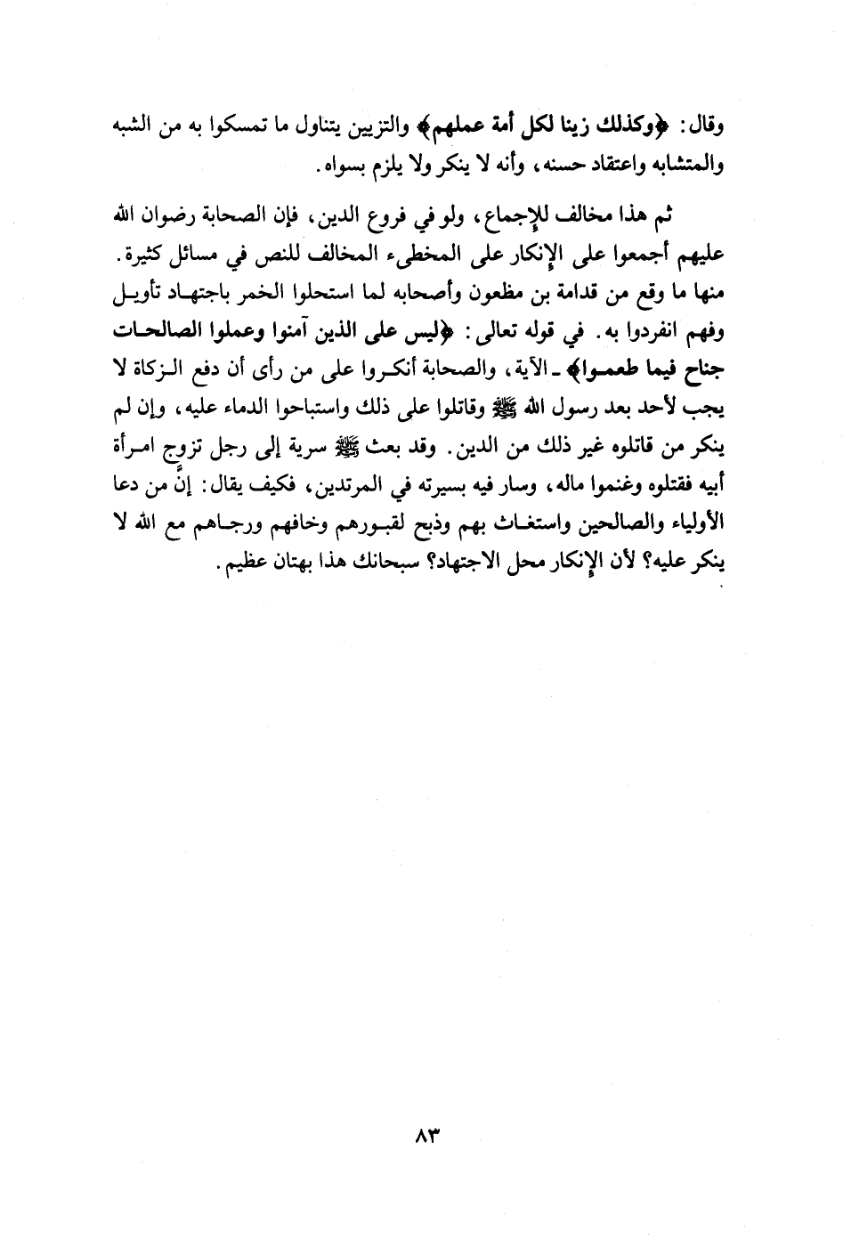 منها ما وقع من قدامة بن مظعون وأصحابه لما استحلوا الخمر باجتهاد تأويل وفهم انفردوا به، في قوله تعالى: {لَيْسَ عَلَى الَّذِينَ آمَنُوا وَعَمِلُوا الصَّالِحَاتِ جُنَاحٌ فِيمَا طَعِمُوا} الآية (المائدة: من الآية93) ، والصحابة أنكروا على من رأى أن دفع الزكاة لا يجب لأحد بعد رسول الله صلى الله عليه وسلّم وقاتلوا على ذلك واستباحوا الدماء عليه، وإن لم ينكر من قاتلوه غير ذلك من الدين. وقد بعث صلى الله عليه وسلّم سرية إلى رجل تزوج امرأة أبيه فقتلوه وغنموا ماله، وسار فيه بسيرته في المرتدين، فكيف يقال: إن من دعا الأولياء والصالحين واستغاث بهم وذبح لقبورهم وخافهم ورجاهم مع الله لا ينكر عليه؟ لأن الإنكار محل الاجتهاد؟ سبحانك هذا بهتان عظيم.