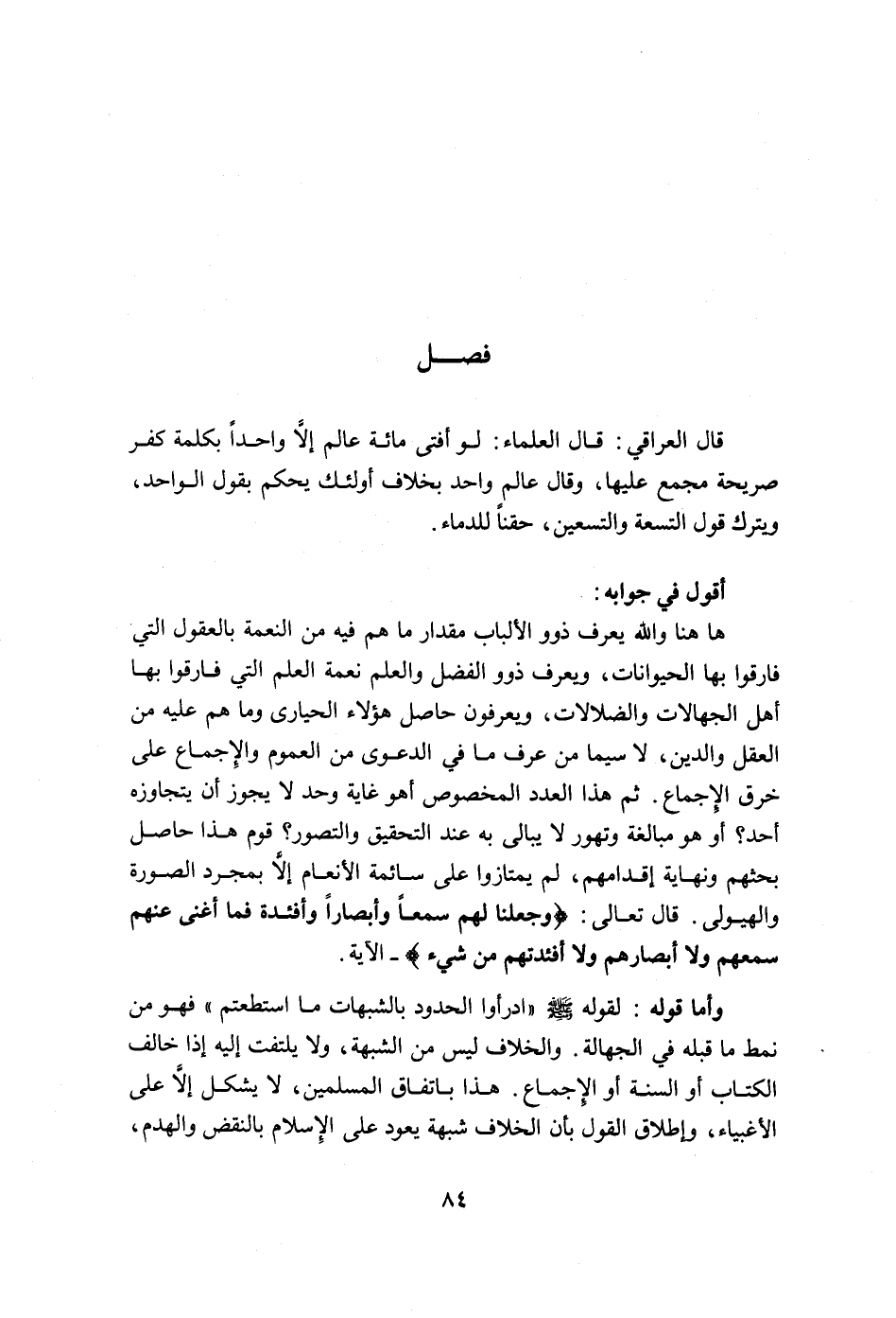 ها هنا والله يعرف ذوو الألباب مقدار ما هم فيه من النعمة بالعقول التي فارقوا بها الحيوانات، ويعرف ذوو الفضل والعلم نعمة العلم التي فارقوا بها أهل الجهالات والضلالات، ويعرفون حاصل هؤلاء الحيارى وما هم عليه من العقل والدين، لا سيما من عرف ما في الدّعوى من العموم والإجماع على خرق الإجماع، ثم هذا العدد المخصوص أهو غاية وحد لا يجوز أن يتجاوزه أحد؟ أو هو مبالغة وتهور لا يبالي به عند التحقيق والتصور؟ قوم هذا حاصل بحثهم ونهاية إقدامهم، لم يمتازوا على سائمة الأنعام إلا بمجرد الصورة والهيولى. قال تعالى: {وَجَعَلْنَا لَهُمْ سَمْعاً وَأَبْصَاراً وَأَفْئِدَةً فَمَا أَغْنَى عَنْهُمْ سَمْعُهُمْ وَلا أَبْصَارُهُمْ وَلا أَفْئِدَتُهُمْ مِنْ شَيْءٍ} الآية (الاحقاف: من الآية26) .