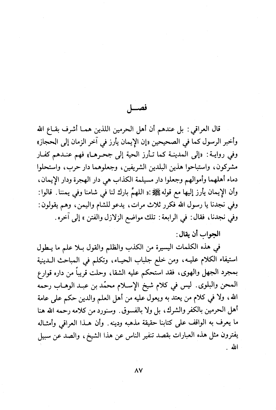 في هذه الكلمات اليسيرة من الكذب والظلم والقول بلا علم ما يطول استيفاء الكلام عليه، ومن خلع جلباب الحياء، وتكلّم في المباحث الدينية بمجرد الجهل والهوى، فقد استحكم عليه الشقا، وحلت قريباً من داره قوارع المحن والبلوى. ليس من كلام شيخ الإسلام محمد بن عبد الوهاب رحمه الله، ولا في كلام من يعتد به ويعول عليه من أهل العلم والدين حكم على عامة أهل الحرمين بالكفر والشرك، بل ولا بالفسوق. وسنورد من كلامه رحمه الله هنا ما يعرف به الواقف على كتابنا حقيقة مذهبه ودينه. وأن هذا العراقي وأمثاله يتفترون مثل هذه العبارات بقصد تنفير الناس عن هذا الشيخ، والصد عن سبيل الله.