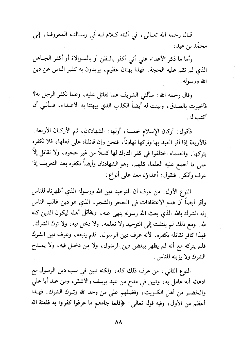قال رحمه الله تعالى، وفي أثناء كلام له في رسالته المعروفة إلى محمد بن عيد: