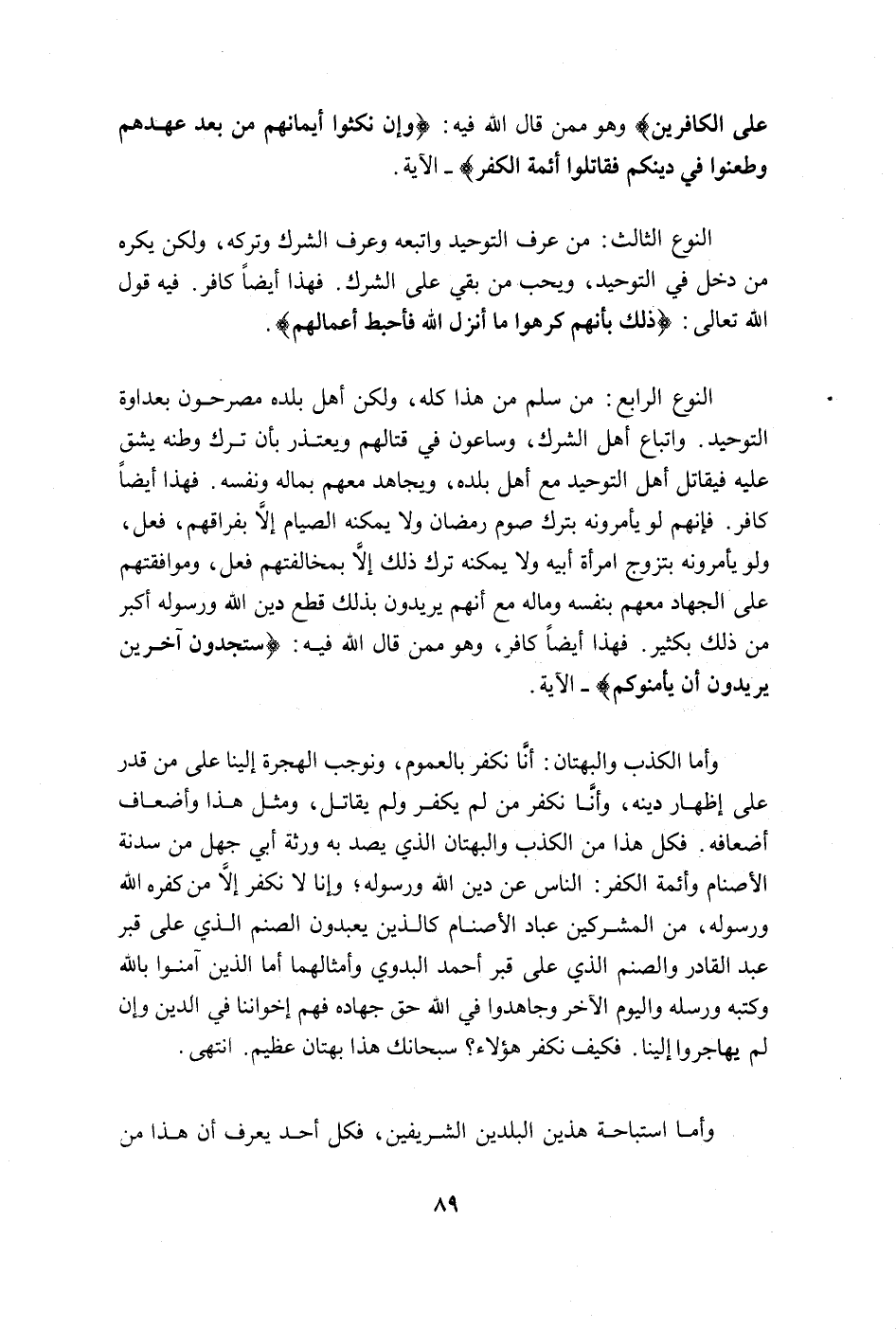 وأما الكذب والبهتان: أنّا نكفر بالعموم، ونوجب الهجرة إلينا على من قدر على إظهار دينه، وأنّا نكفر من لم يكفر ولم يقاتل، ومثل هذا وأضعاف أضعافه. فكل هذا من الكذب والبهتان الذي يصدّ به ورثة أبي جهل من سدنة الأصنام وأئمّة الكفر: الناس عن دين الله ورسوله؛ وإنّا لا نكفر إلاّ من كفّره الله ورسوله، من المشركين عباد الأصنام كالذين يعبدون الصنم الذي على قبر عبد القادر والصنم الذي على قبر أحمد البدوي وأمثالهما أما الذين آمنوا بالله وكتبه ورسله واليوم الآخر وجاهدوا في الله حق جهاده فهم إخواننا في الدين وإن لم يهاجروا إلينا. فكيف نكفر هؤلاء؟ سبحانك هذا بهتان عظيم. انتهى.