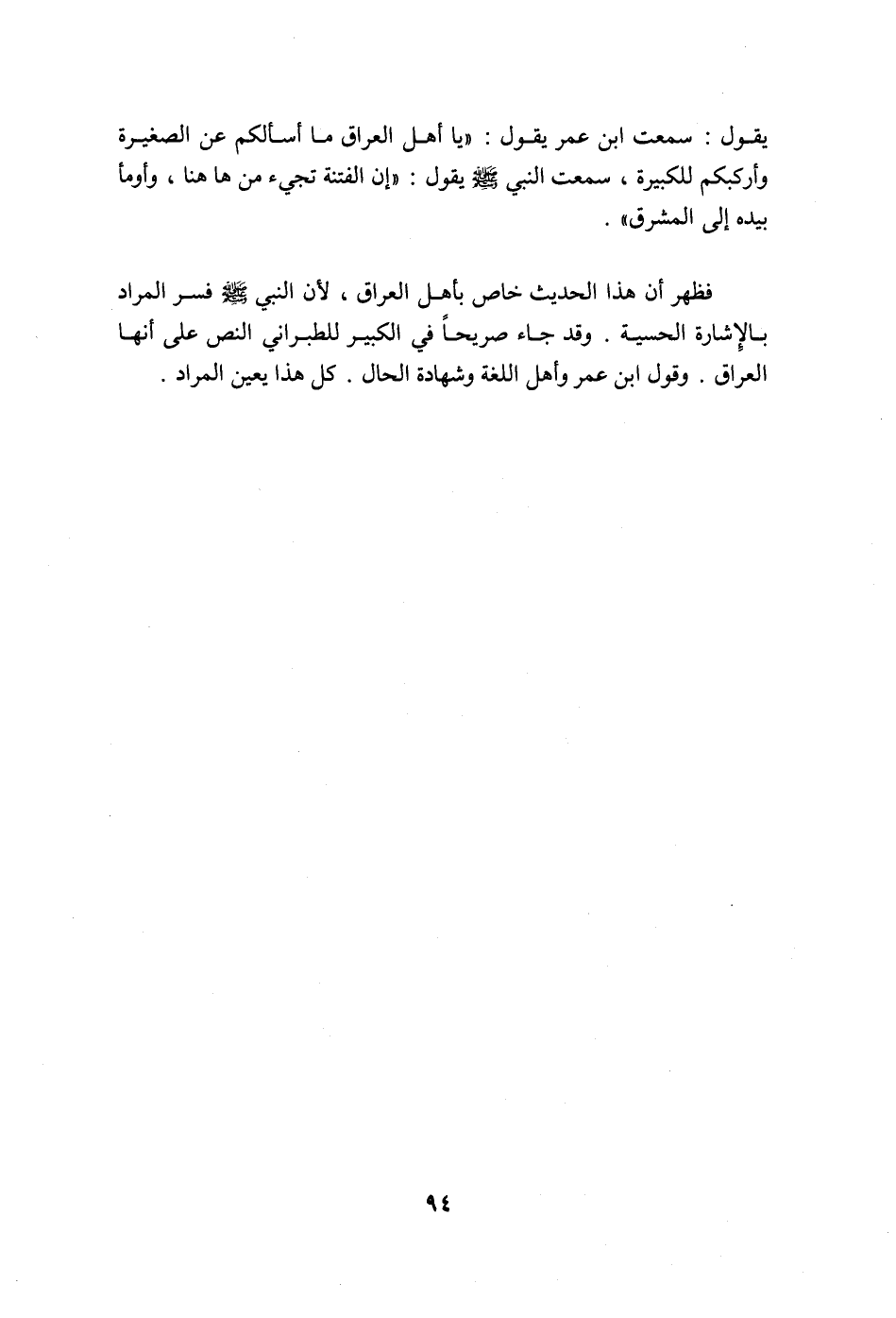 يقول: سمعت ابن عمر يقول: "يا أهل العراق ما أسألكم عن الصغيرة وأركبكم للكبيرة، سمعت النّبي صلى الله عليه وسلّم يقول: "إنّ الفتنة تجئ من هاهنا، وأومأ بيده إلى المشرق".